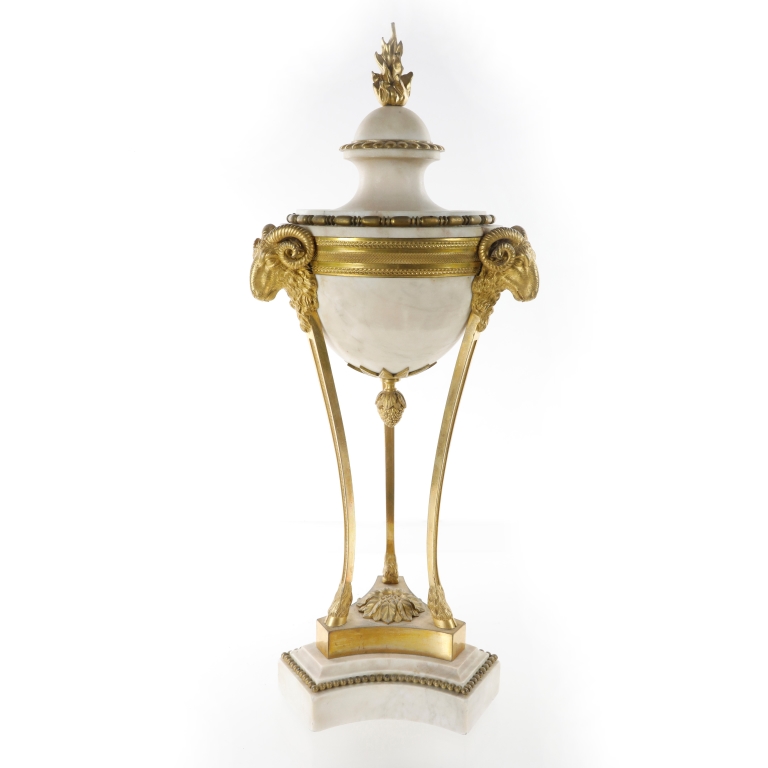 Cassolette con struttura a tripode, sostegni a foggia di teste di ariete e piedi a zoccolo.