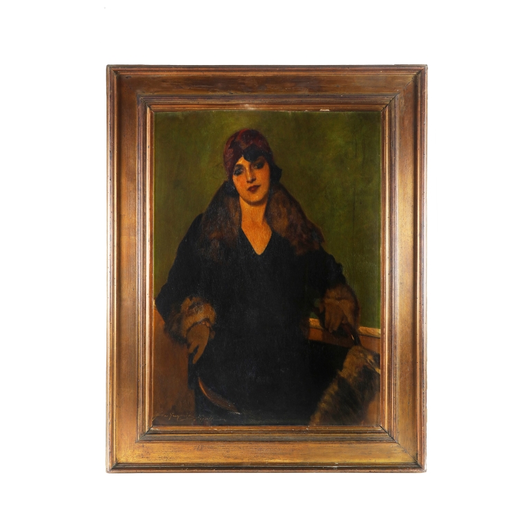 Grande dipinto olio su tavola, raffigurante giovane donna con pelliccia