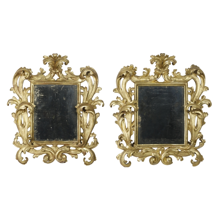 Coppia di specchiere in legno intagliate e dorate a foglia oro con specchi originali molati al mercurio. Provenienza collezione Famiglia Rangoni.