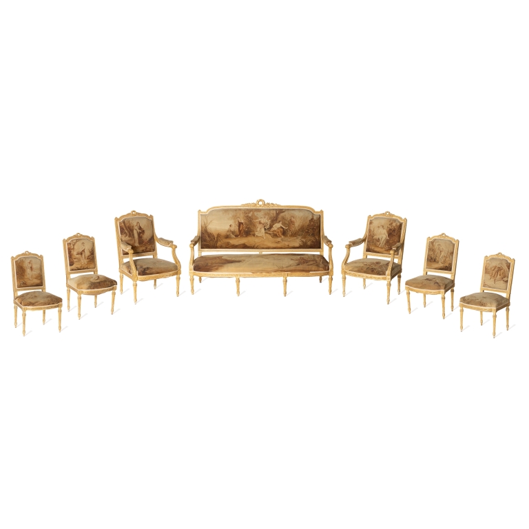 Salotto composto da divano, due poltrone e quattro sedie stile Luigi XVI.