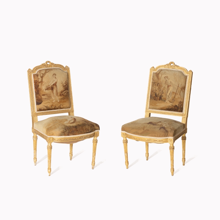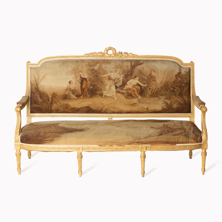 Tappezzeria in gobelin, raffigurante paesaggi e scene romantiche.