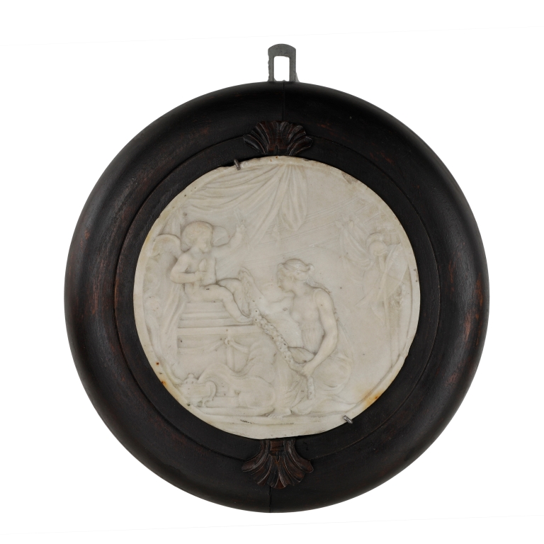 Altorilievo tondo in marmo bianco raffigurante la dea Venere genuflessa che porge ghirlanda di fiori ad Amore.