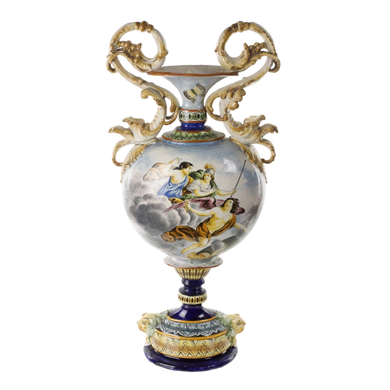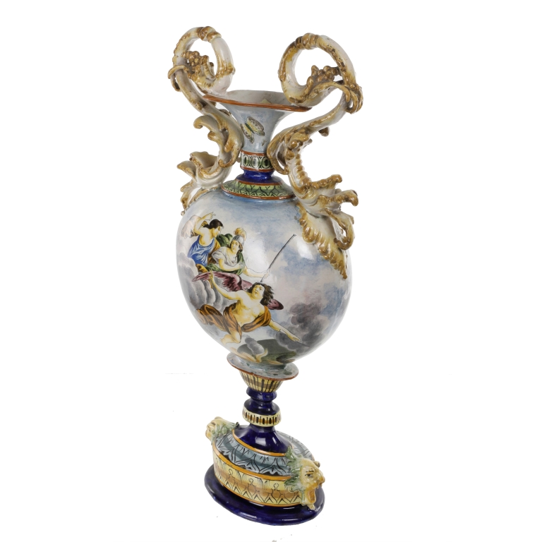 Vaso in maiolica dipinto a tutto tondo con scene mitologiche.