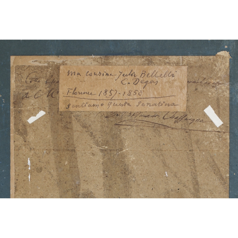 Un importante disegno di Edgar Degas, che testimonia la sua seconda presenza in Italia, dove oltre a visitare i parenti, veniva per arricchirsi attraverso lo studio dei grandi maestri della pittura rinascimentale. Proprio nel corso di una delle sue visite presso la famiglia della sorella del padre, sposatasi con il barone Bellelli, imprime sul foglio l’immagine di una delle due cugine, Giulia, seduta dinanzi al pianoforte come si intuisce dalla dicitura a tergo della matita “ma cousine Julie Bellelli / E. Degas / Florence 1857-1858 / sentiamo questa sonatina”. Il disegno è di indubbio interesse oltre che per l’importante firma del suo esecutore, anche perché è un documento attestante la seconda presenza di Degas in Italia, il “23 avril 1860 / Florence” come scritto dall’artista in basso al disegno per sospendere la propria memoria, e per aver fermato un momento intimo della vita affettiva di questo straordinario artista «Ho due cuginette a pranzo. La maggiore è veramente un fiore di bellezza; la minore ha il carattere di un diavoletto e la bontà di un angelo. Le dipingo con i loro vestiti neri e i loro grembiulini bianchi che le rendono affascinanti. Ho varie idee per lo sfondo. Vorrei ottenere una certa grazia naturale assieme a una nobiltà che non riesco bene a definire». Peraltro, si segnala che la scritta sopra riportata, non compare nella scheda del catalogo del 1983, quando il foglio venne esposto nella significativa mostra dedicata proprio al legame intrattenuto dal pittore con gli zii della famiglia in Firenze realizzata a Copenaghen (Degas et la famille Bellelli, catalogo della mostra a cura di Hanne Finsen, Copenhagen 1983, pp. 79-80, n. 5). Si veda anche il contributo di J. Sutherland Boggs, La famiglia Bellelli, nell’articolo apparso in “The Art Bullettin”, (juin 1955, n. 2, pp. 127-136) e nella relativa traduzione (Edgar Degas et les Bellelli, pp. 14-19) pubblicata nel suddetto catalogo danese.