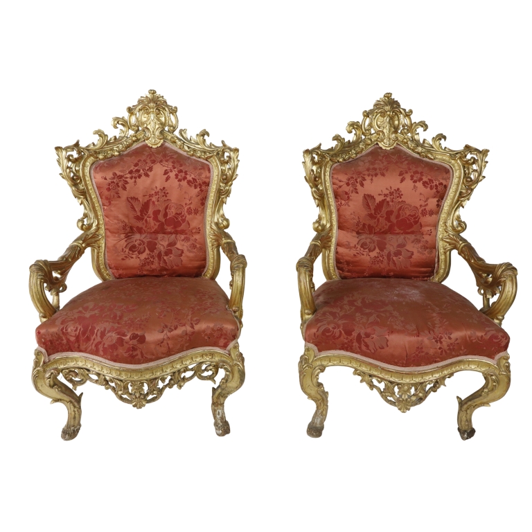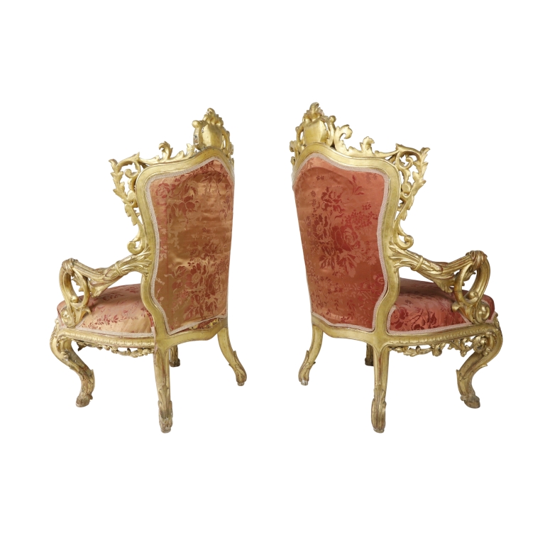 Preziosa e raffinata coppia di poltrone dorate con braccioli, riccamente intagliate.
