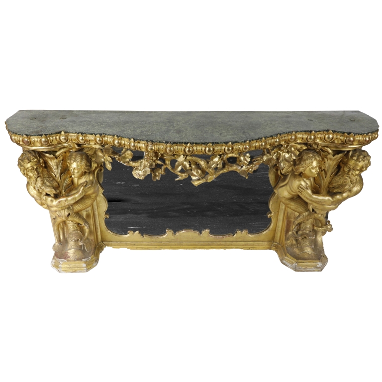 Straordinaria consolle monumentale dorata, di gusto barocco, di eccezionale impatto scenografico.