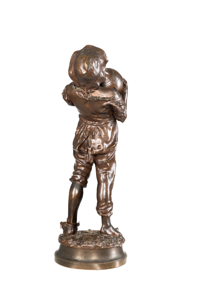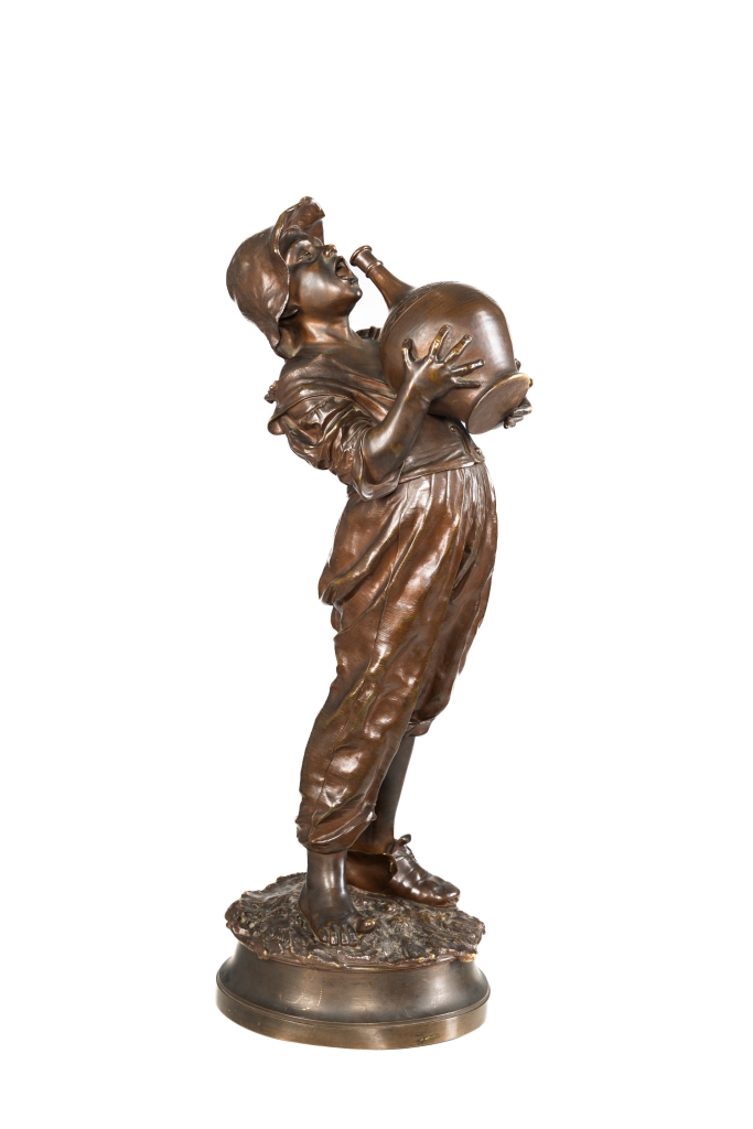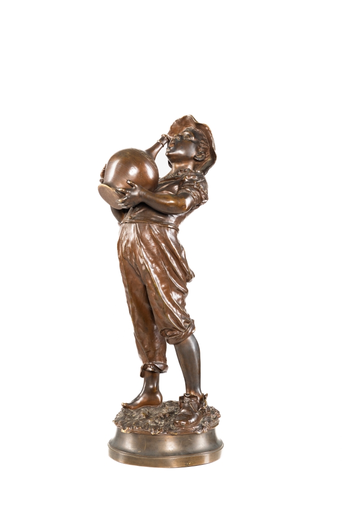 Scultura in bronzo raffigurante giovane che beve da un fiasco.