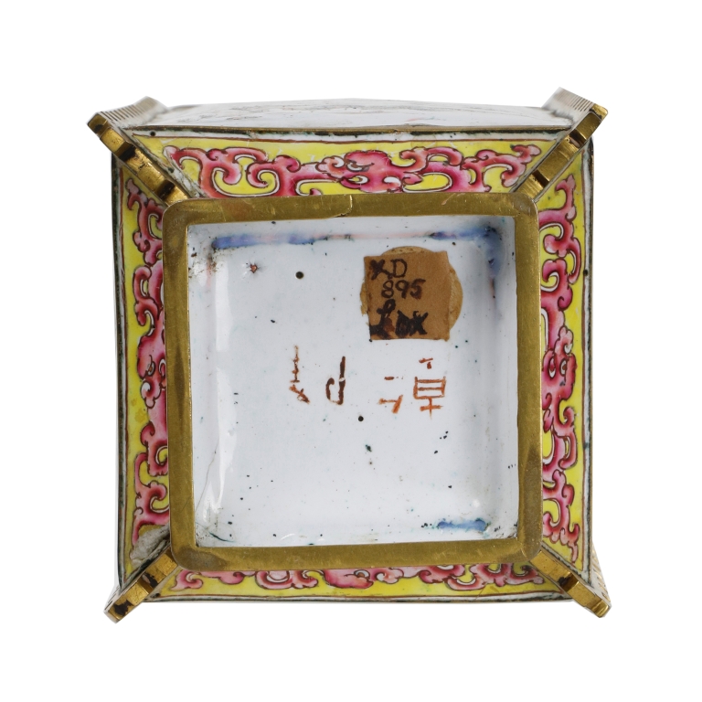 Vaso in bronzo smaltato di forma squadrata decoro di figure e paesaggi, profili rivestiti in bronzo dorato