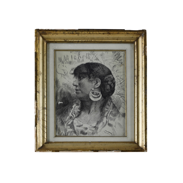 Tecnica mista Profilo di donna abruzzese con "sciacquajje" realizzato a tecnica "china su carta" incollata su cartoncino pressato.