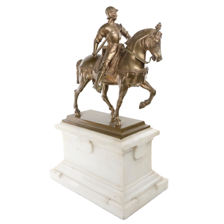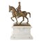 Scultura in bronzo raffigurante "Soldato a cavallo" su basamento in marmo bianco