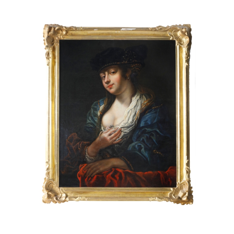 Olio su Tela cm70,2x55,7 (cornice 83,5x70) Dipinto olio su tela raffigurante giovane donna con cappello, impreziosita con spilla di perle sul cappello, orecchini e collana di perle, ambito di Pietro Rotari