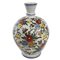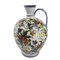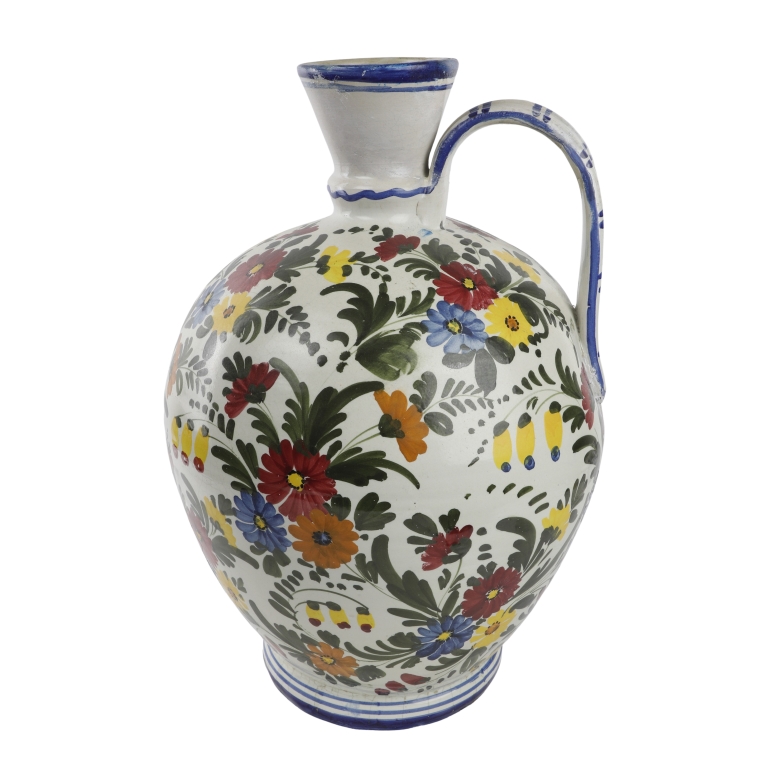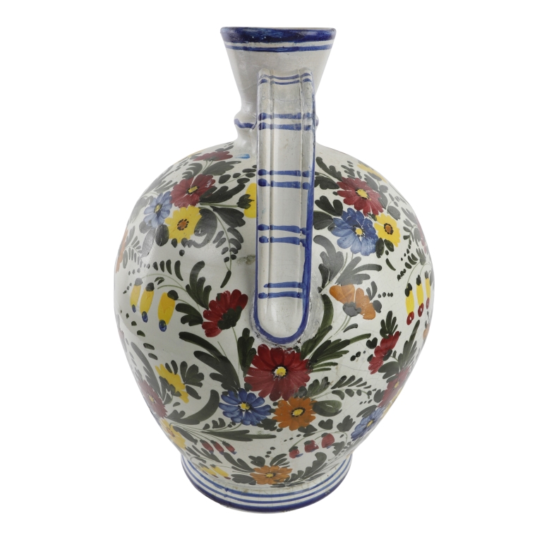 Fiasca in ceramica decorata, con collo a tromba e ansa a nastro