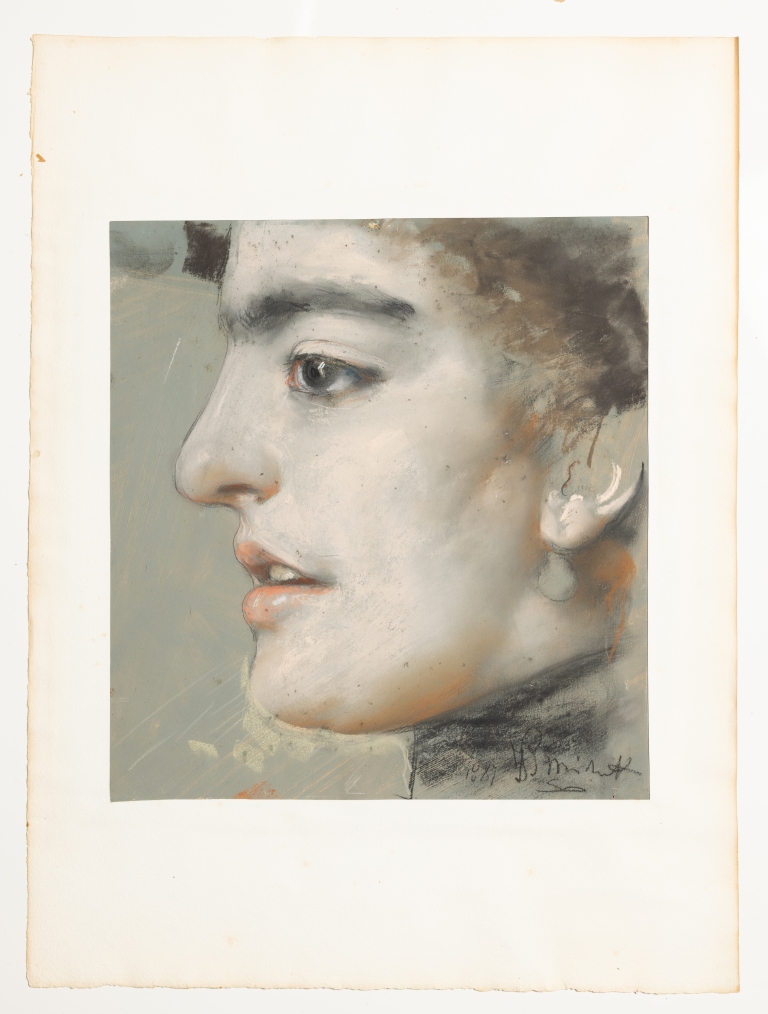 Mista su carta 33,5 x 31,0 Profilo di fanciulla con orecchino, tecnica mista su carta. Firmato in basso a destra F.P. Michetti  1887.