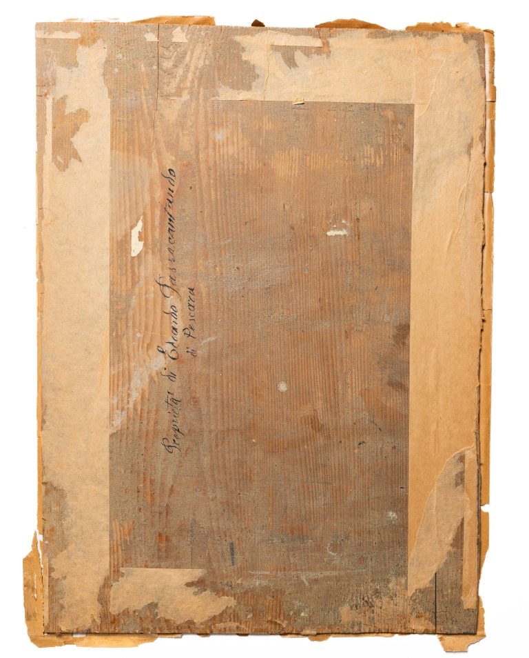 Antica scritta sul retro del fondo di legno " Proprietà di Edoardo Passacantando di Pescara"