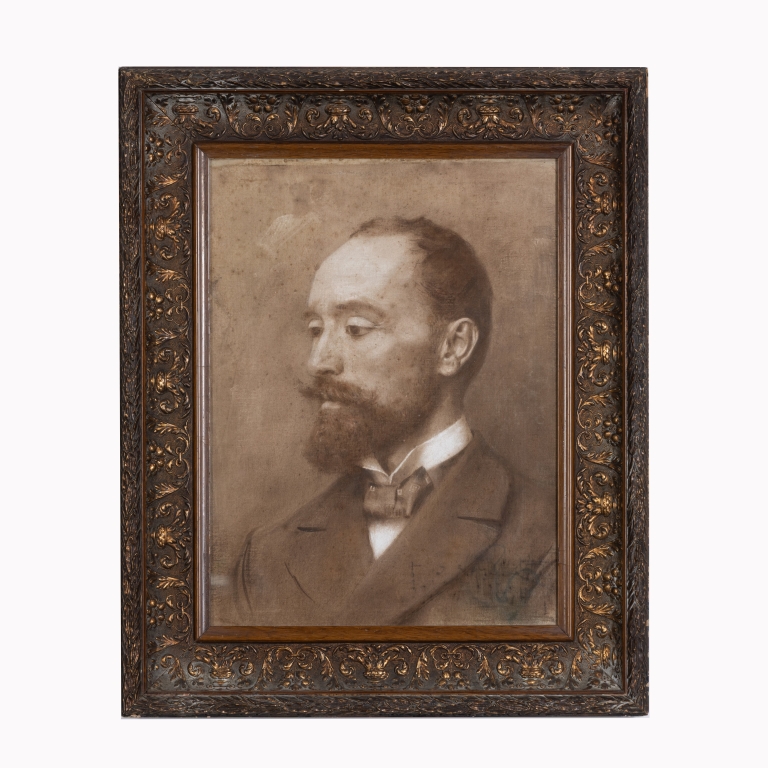 Dipinto monocromo su tela raffigurante "autoritratto" del pittore, firmato in basso a destra. In questo autoritratto, data la posizione di profilo del volto, l'artista si è sicuramente avvalso di una sua impressione fotografica. Autentica a cura del Prof. Piero Dini su foto.