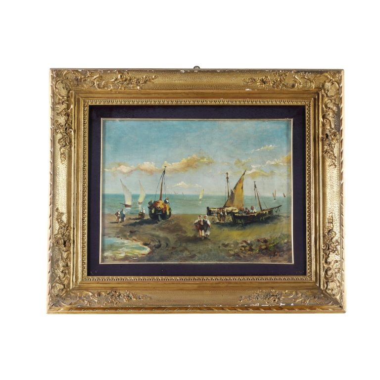 Olio su Tela Cm 40,0 x 50,5 (cornice 67x77) Dipinto olio su tela raffigurante Marina con barche.