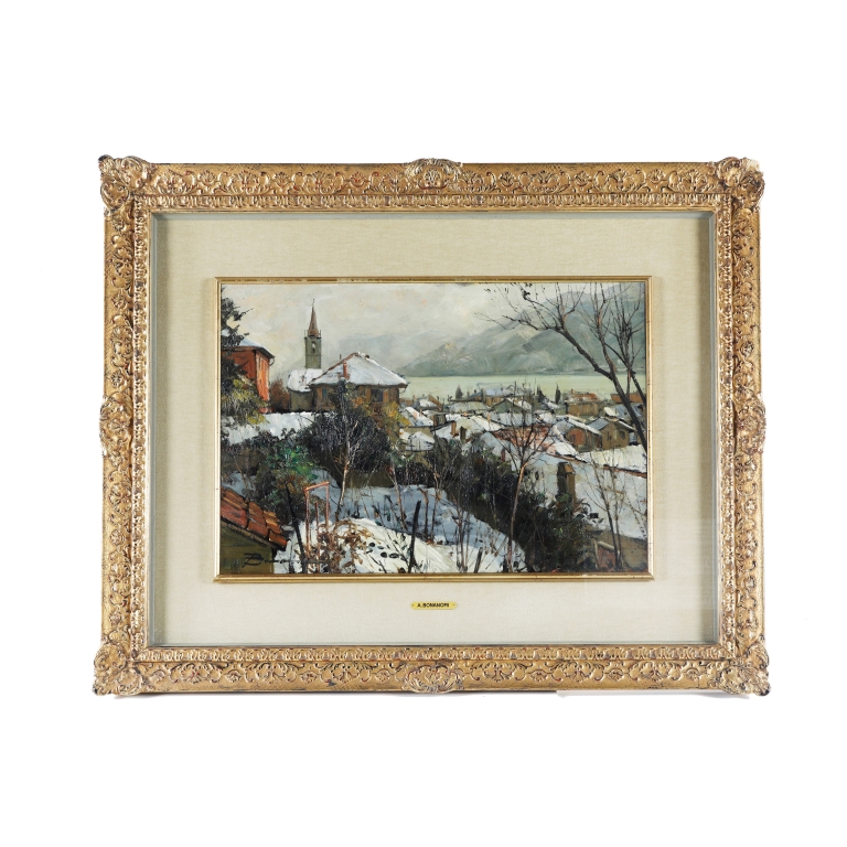 Olio su Tela Dipinto olio su tela raffigurante paesaggio innevato di di Varenna sul Lago di Como.