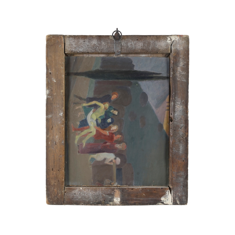 Olio su tela incollato su pannello di legno, cornice (Marche) coeva in legno di pioppo laccata a finta tartaruga