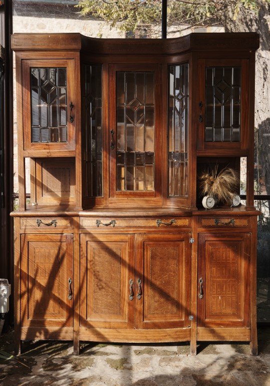 Alzata a tre sportelli con vetri all'inglese, parte inferiore con tre cassetti e quattro sportelli