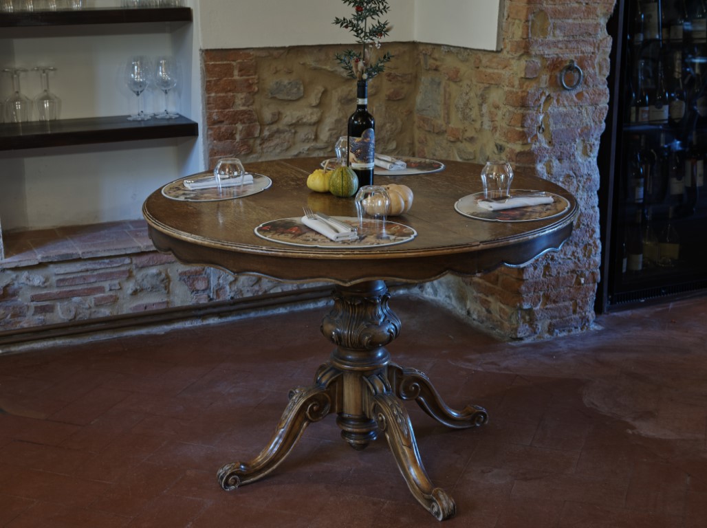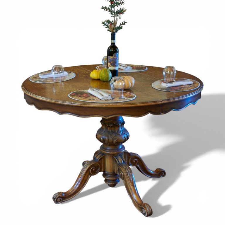 Tavolo rotondo da pranzo allungabile in noce intagliato