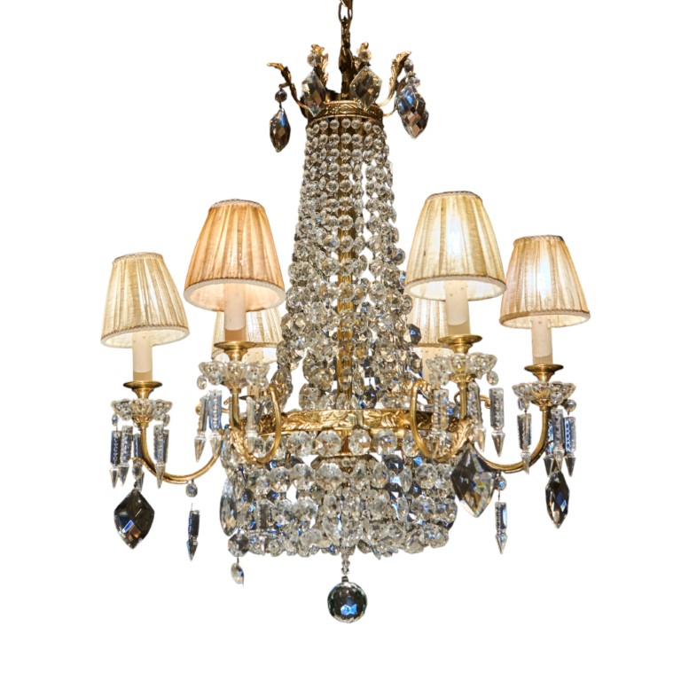 Lampadario in stile Settecento, in metallo e vetro con pendenti e collane in cristallo sfaccettato