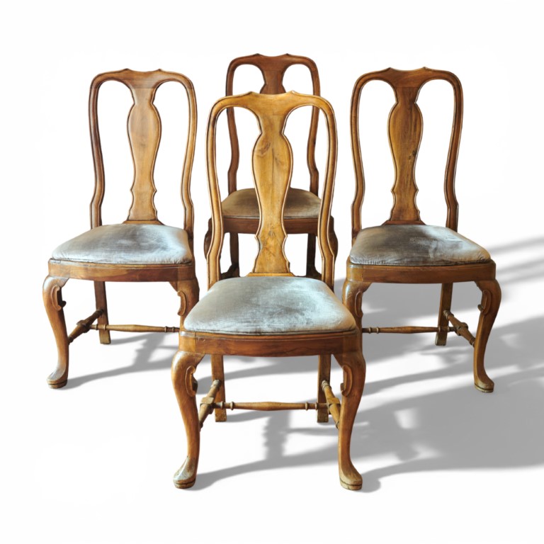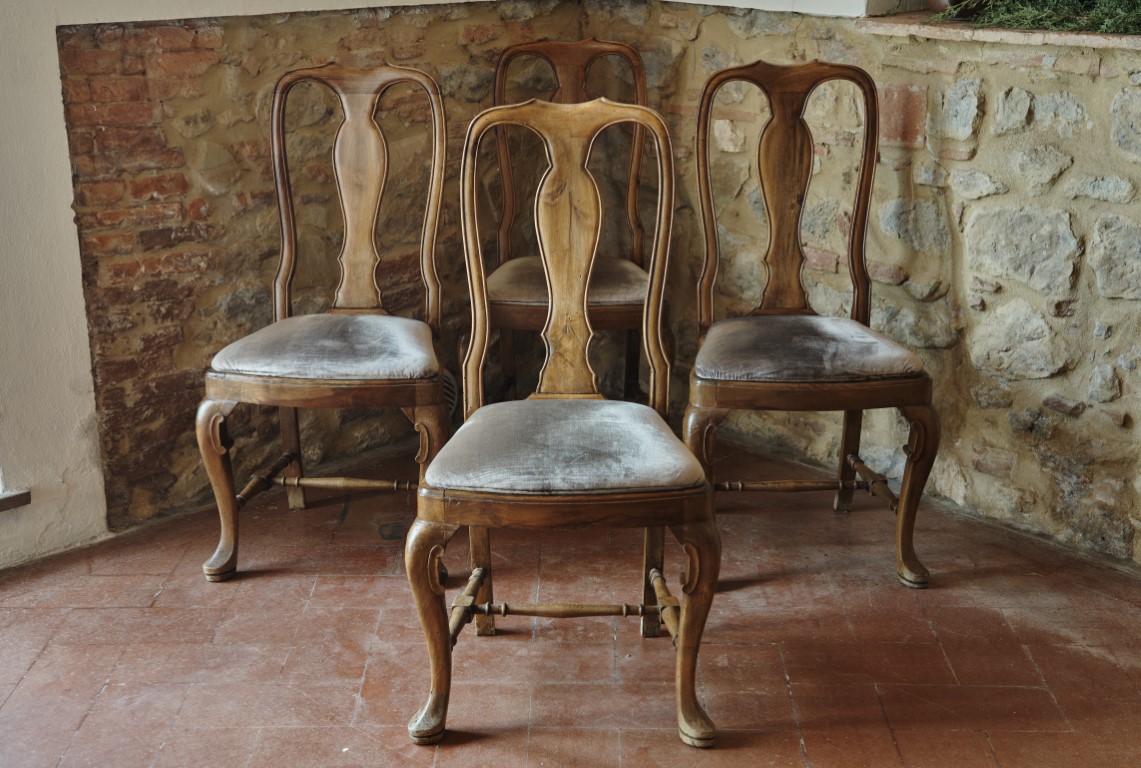 Quattro sedie in stile Settecento in noce biondo intagliato, ricoperte in velluto grigio