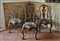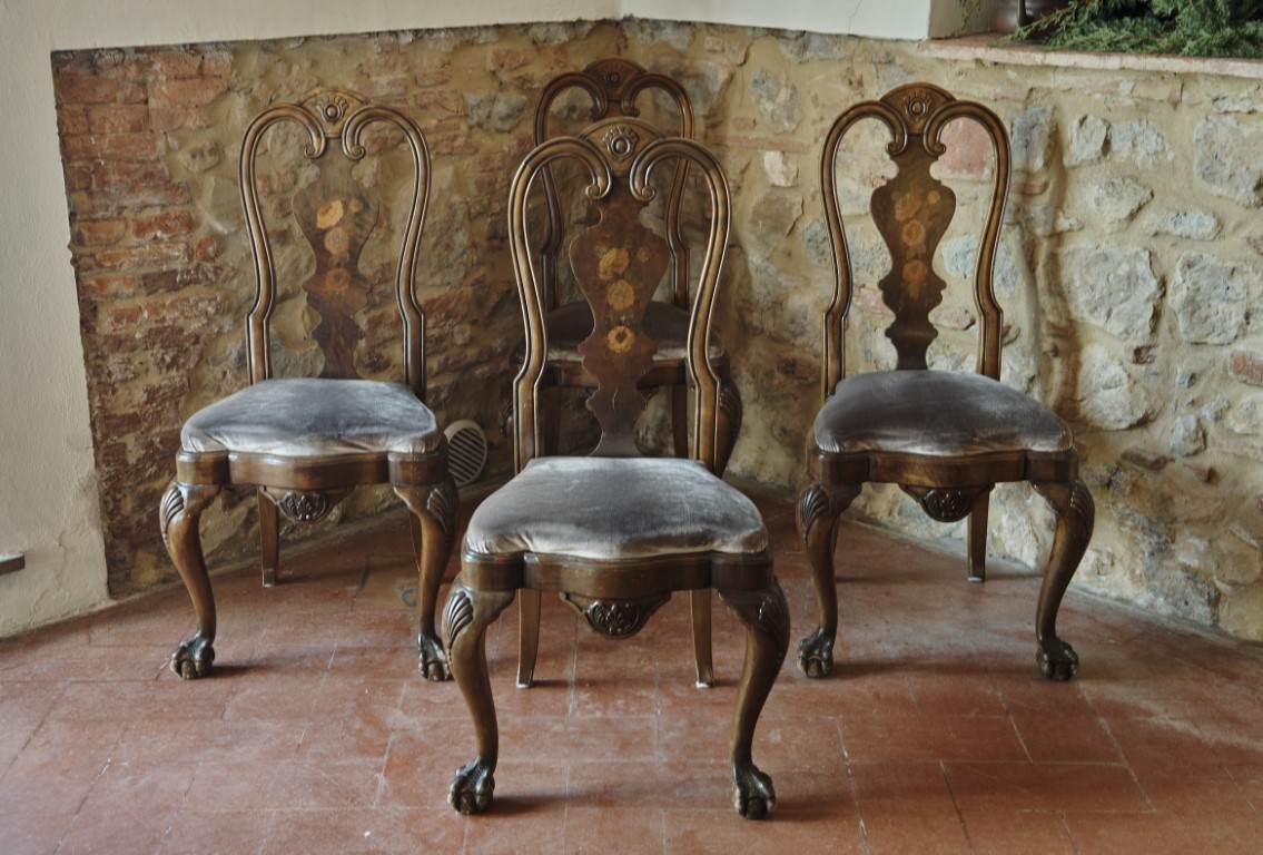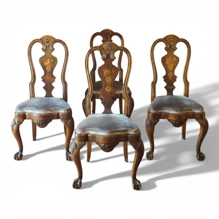 Lotto 188 | Quattro sedie inglesi in noce intarsiato a fiori stile ricoperte in velluto grigio