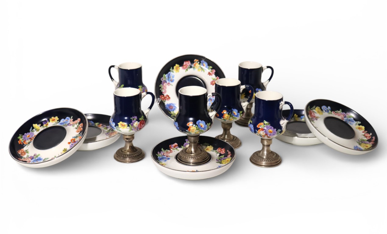 Sei tazzine da caffè in porcellana bianca e blu dipinta a fiori