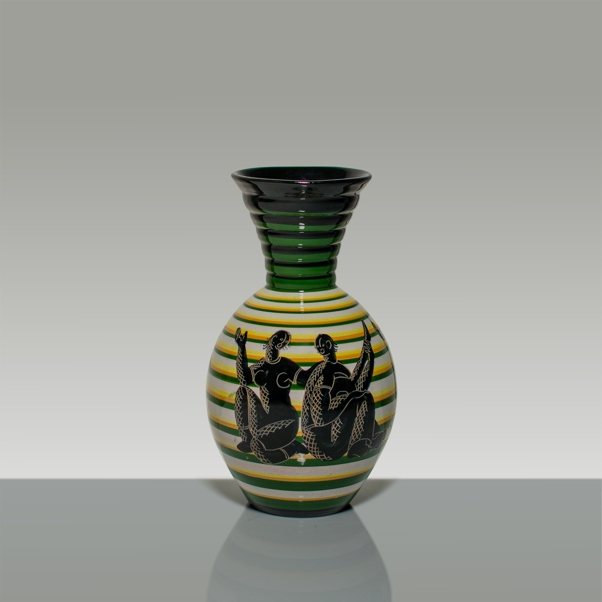 Vaso “Tramonto” in ceramica con decoro di figure su fondo a fasce policrome; altezza cm 23.