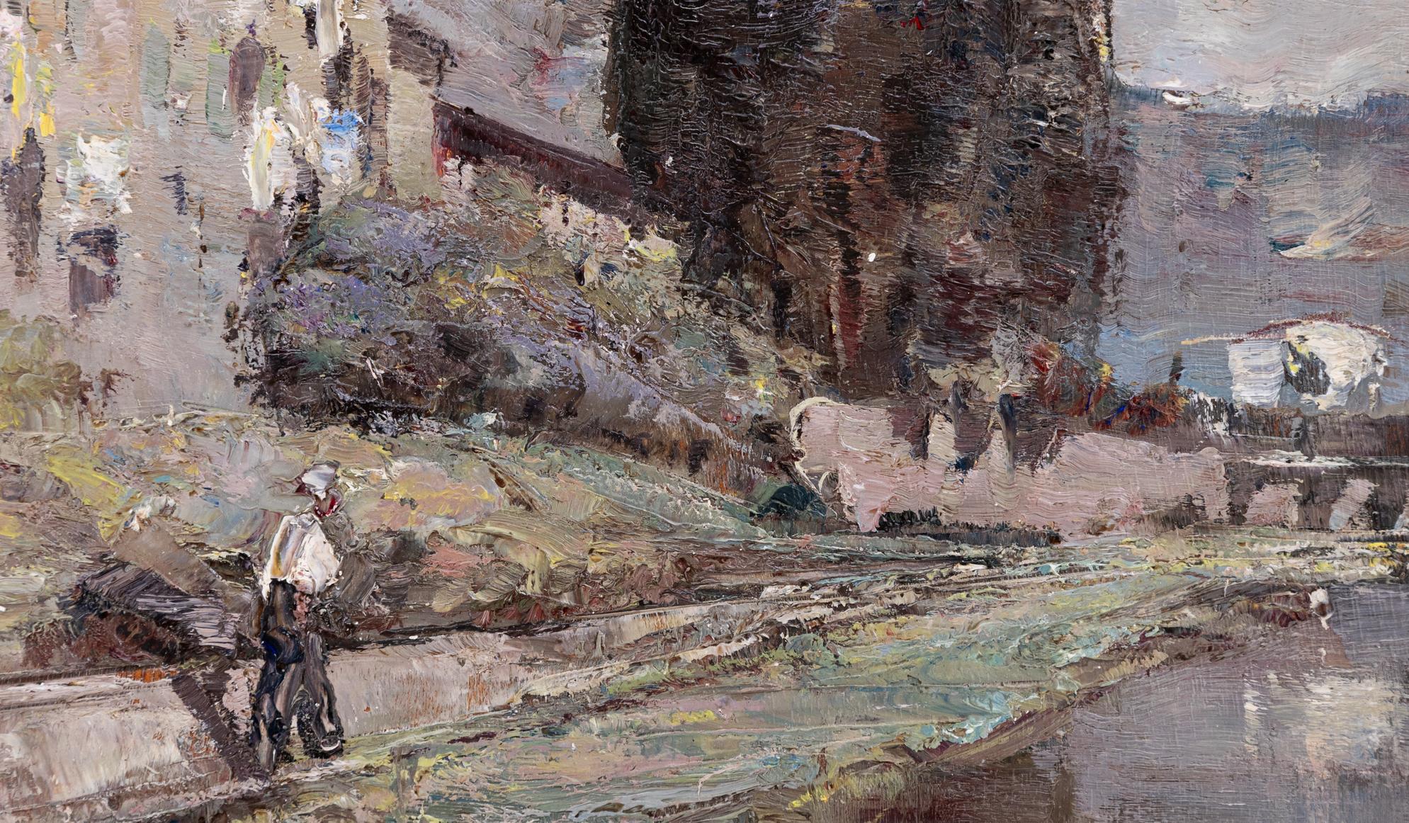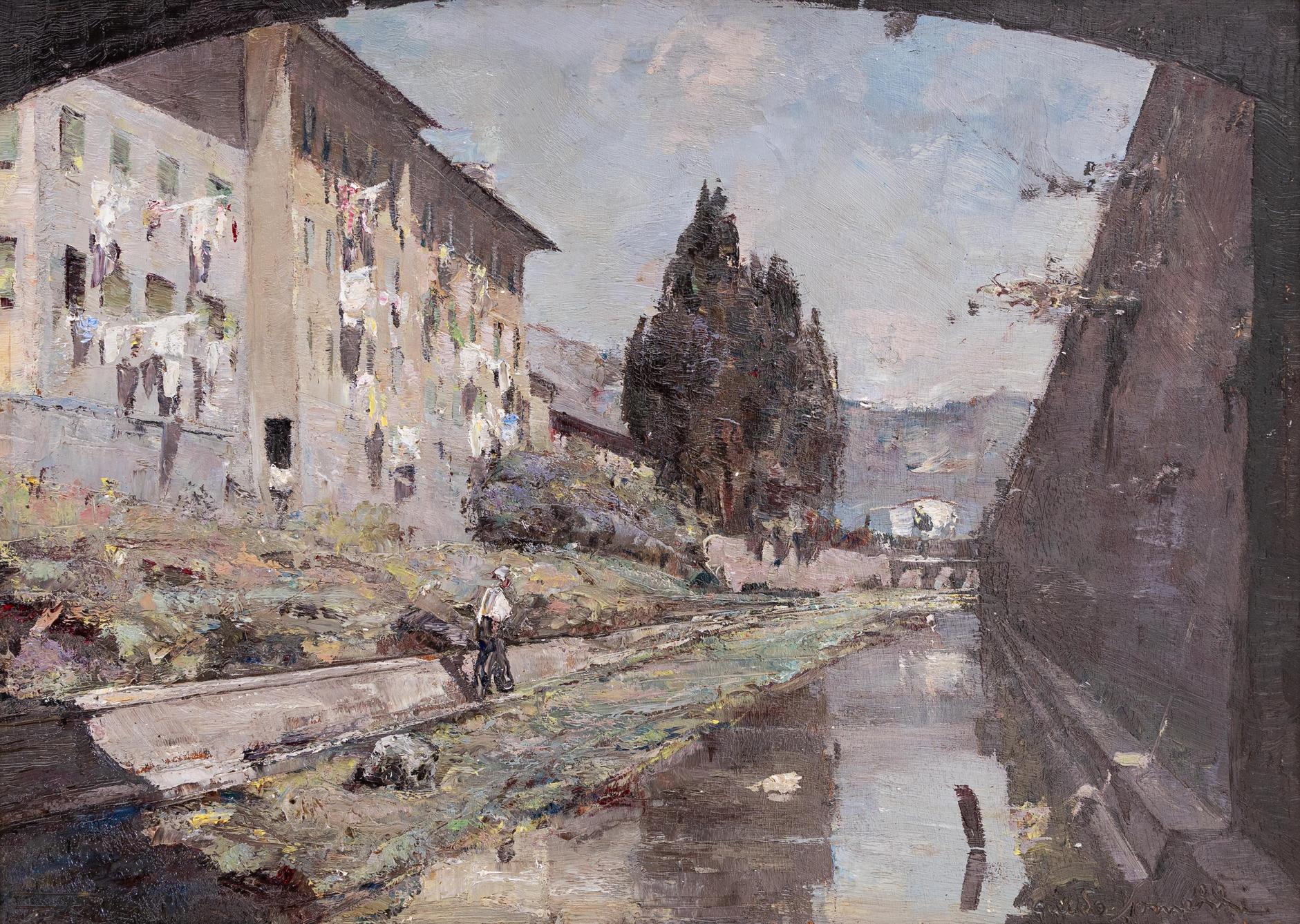 - Guido Somelli nacque a Firenze nel 1881 e qui morì nel 1940, dedicando la sua vita alla pittura figurativa con particolare attenzione ai paesaggi, alle vedute urbane e alle scene di vita quotidiana. Fin da giovane dimostrò talento e passione per l’arte, iniziando a dipingere nella sua città natale e partecipando presto a mostre e rassegne che gli permisero di farsi conoscere, sia in Italia sia, occasionalmente, all’estero.La sua produzione spaziò tra paesaggi della campagna toscana, scorci di Firenze e del suo territorio, nature morte e scene di vita quotidiana, sempre caratterizzate da un’attenzione alla luce, all’atmosfera e ai dettagli. Nel 1913 Somelli partecipò alla Prima Esposizione Internazionale d’Arte della Secessione a Roma, presentando una figura femminile nuda che rivelava la sua apertura verso i linguaggi artistici più ampi e il confronto con i fermenti culturali italiani ed europei.Negli anni Venti e Trenta espose in varie manifestazioni artistiche in Toscana, presentando opere che spaziavano dai paesaggi di campagna a scene di vita rurale, con uno stile che univa precisione descrittiva e sensibilità poetica. Le sue opere mostrano una tavolozza misurata, un tratto sicuro e la capacità di cogliere l’essenza dei luoghi, dalle sponde dell’Arno ai borghi e alle colline toscane, sempre con grande rispetto per l’atmosfera naturale e urbana.Somelli rimase coerente nella sua ricerca di una pittura figurativa radicata nella realtà osservata, convinto che la verità visiva fosse anche espressione di bellezza e poesia.