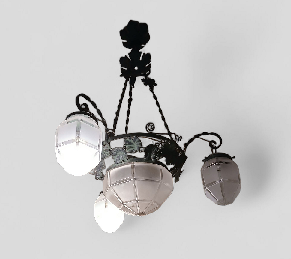 LAMPADARIO A QUATTRO LUCI IN FERRO BATTUTO DECORATO A FOGLIE DI EDERA CON VETRI SATINATI INIZIO XX SECOLO