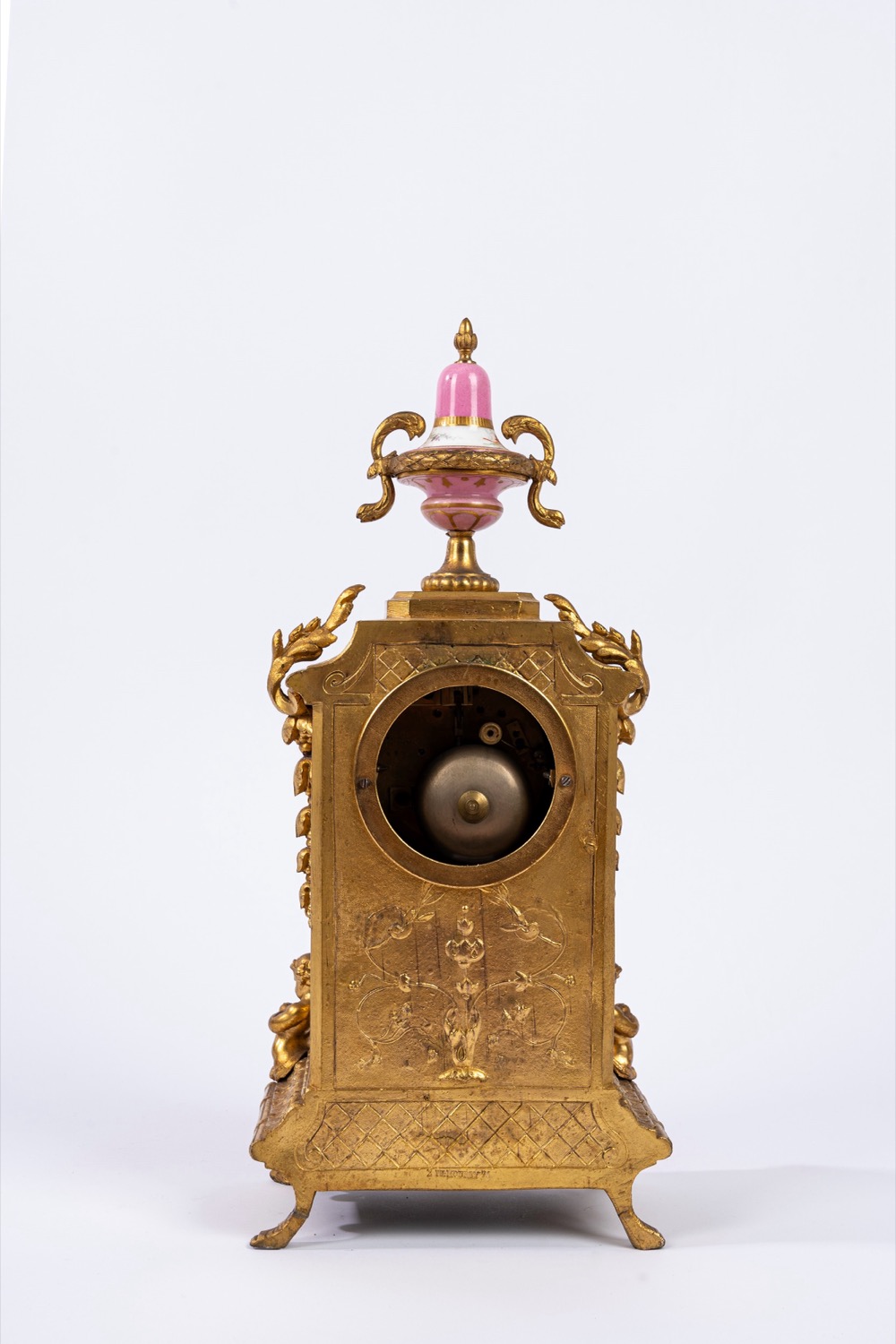 Con scena galante, puttini agli angoli, vaso in porcellana sulla sommità, quadrante in smalto con numeri romani