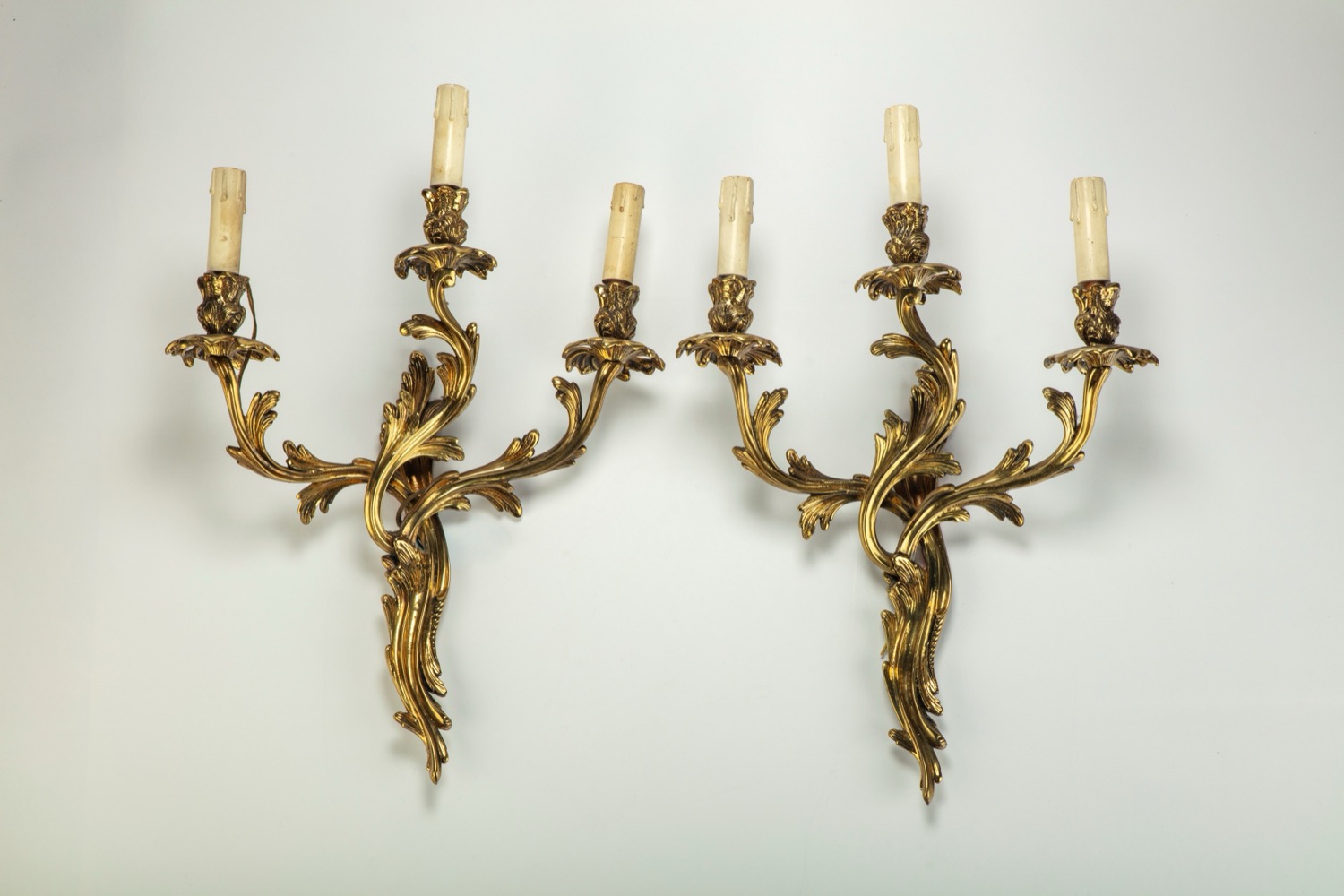 Coppia di applique a tre luci con bracci a volute fogliacee. XX secolo