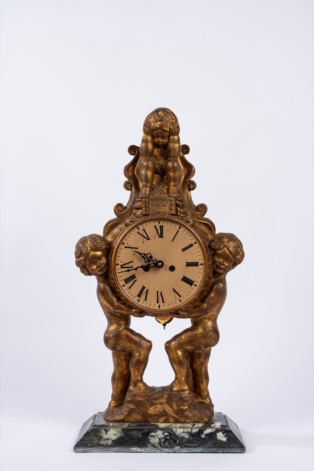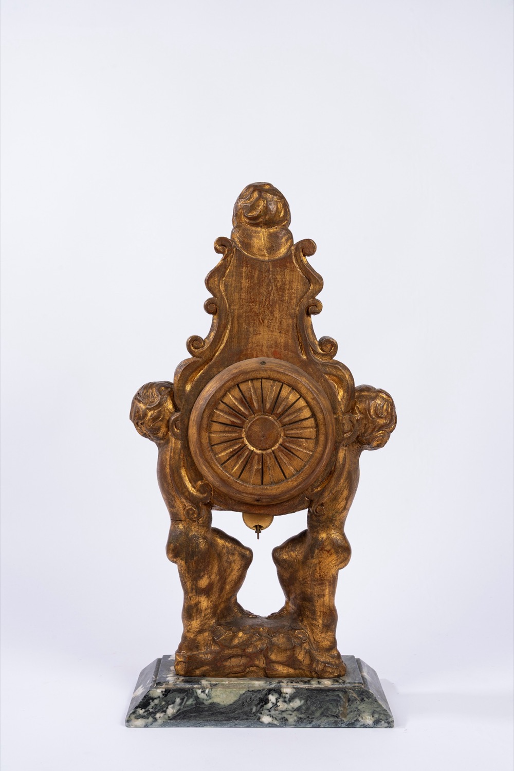 Due puttini che reggono il quadrante e sulla sommità puttino seduto con iscrizione "tempus fugit"Due puttini che reggono il quadrante e sulla sommità puttino seduto con iscrizione "tempus fugit"