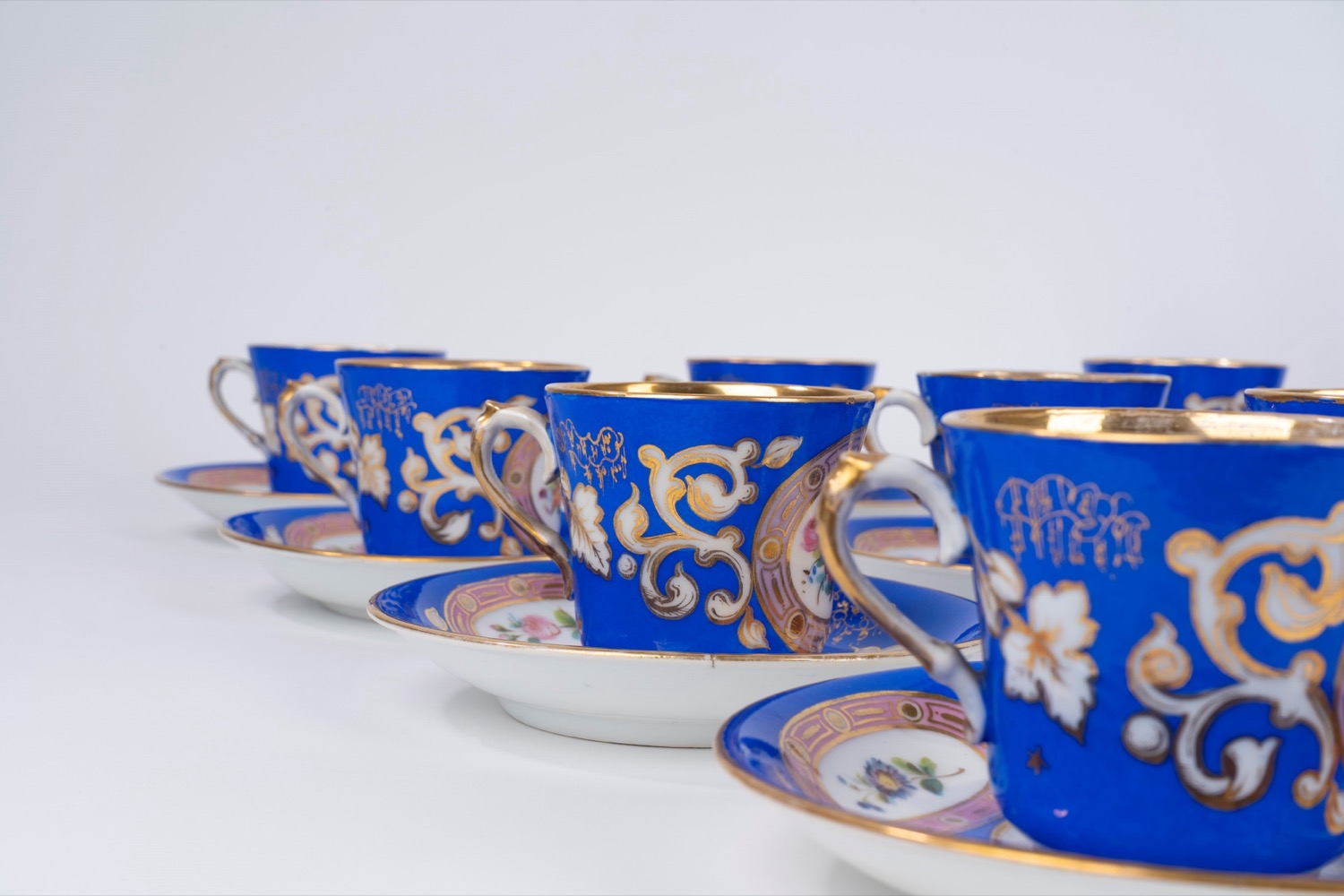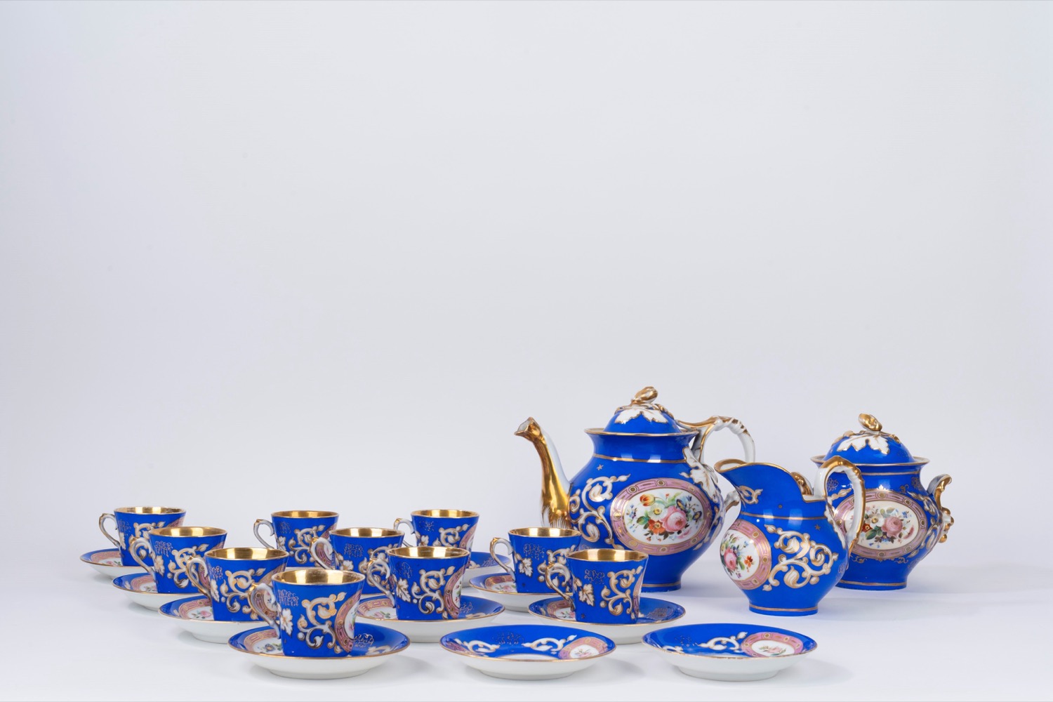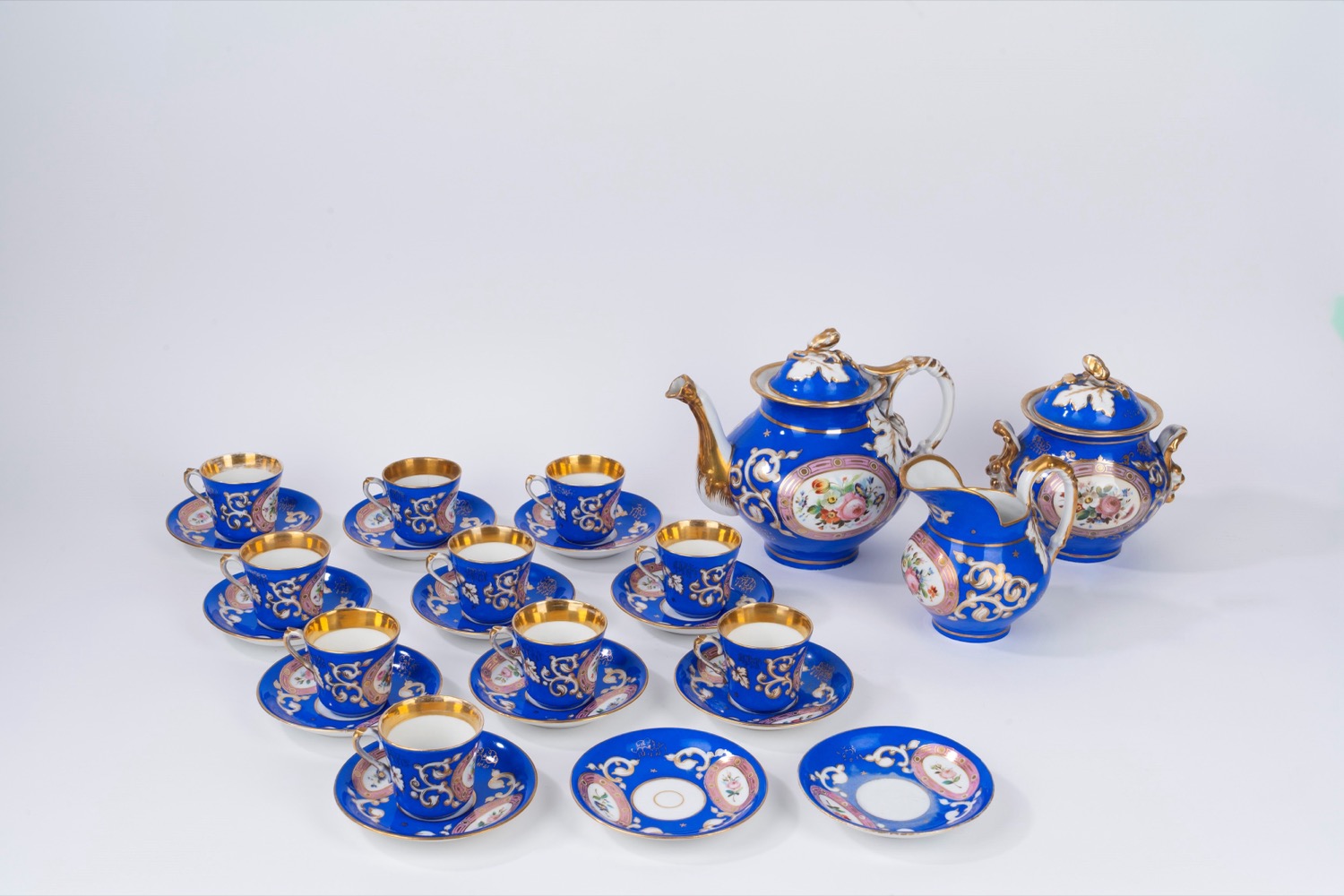 Servizio in porcellana policroma a fondo blu e oro, Francia, Luigi Filippo, secolo XIX