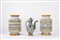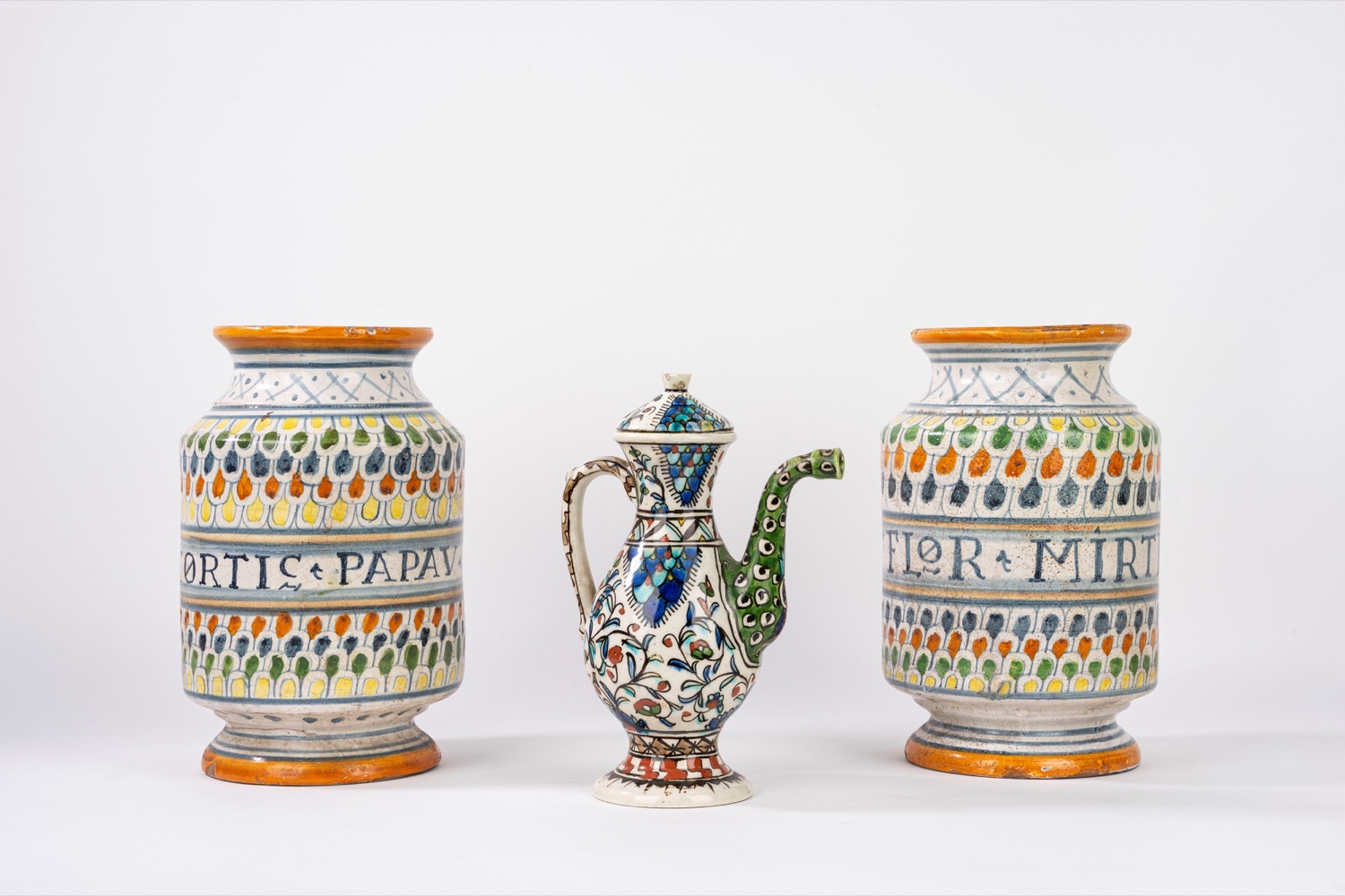 Due albarelli e un'oliera in maiolica policroma