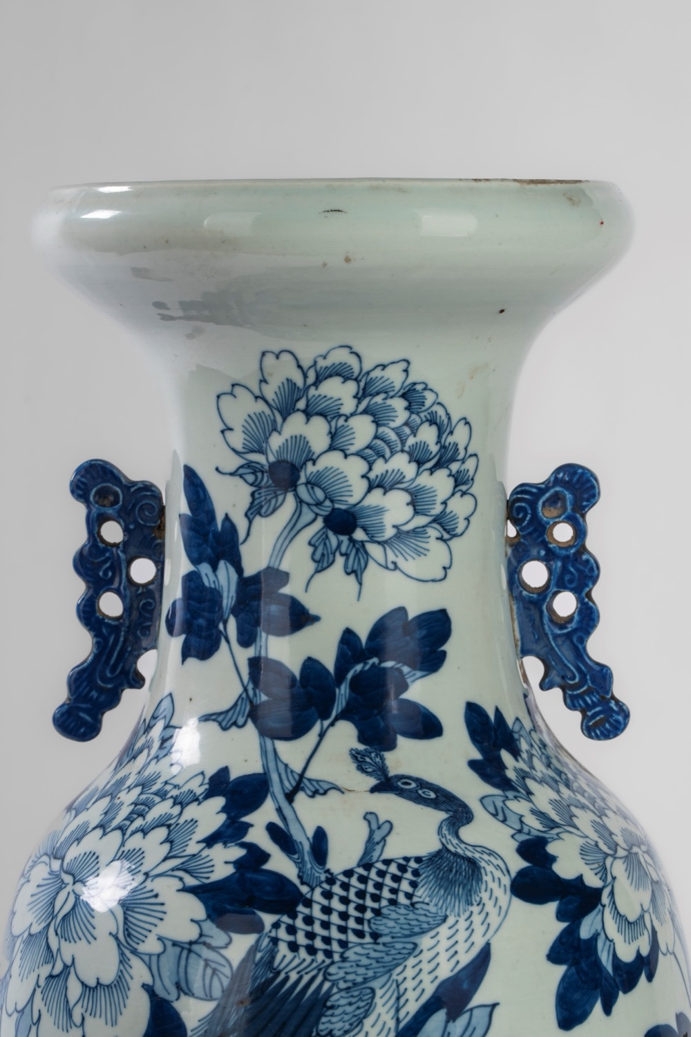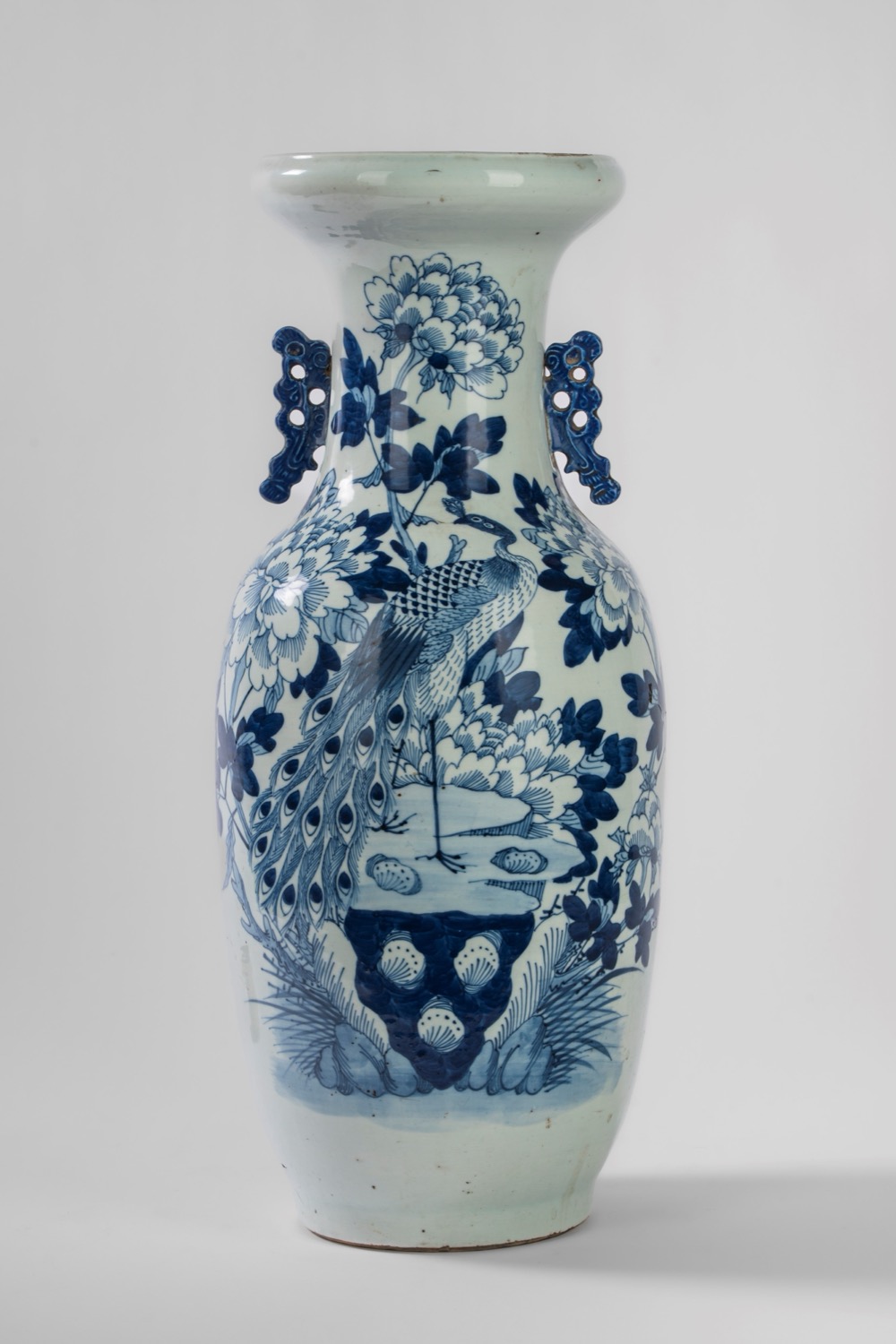 青花瓷大瓶,饰孔雀与花卉纹,带形制把手,中国,清代,19世纪青花瓷大瓶,饰孔雀与花卉纹,带形制把手,中国,清代,19世纪