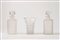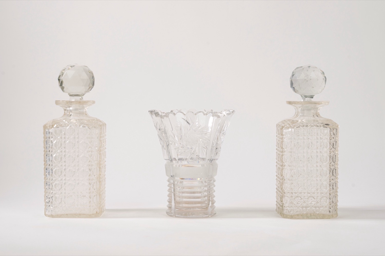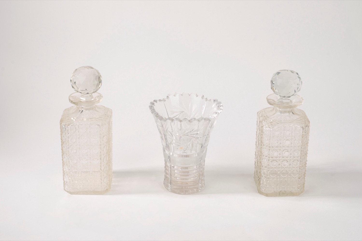 Coppia di bottiglie da liquore con tappo e un vaso portafiori in cristallo molato con decoro a motivi floreali