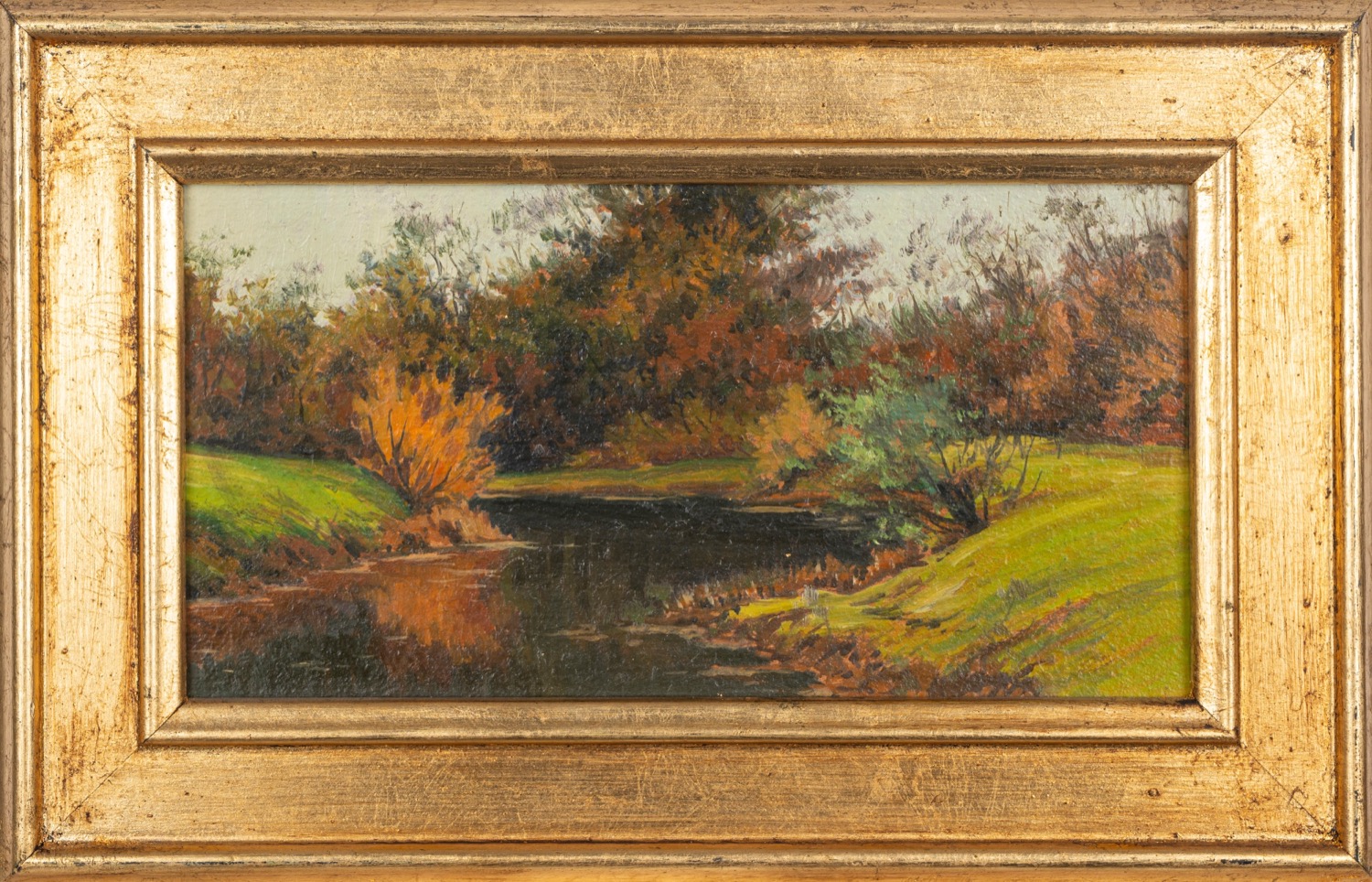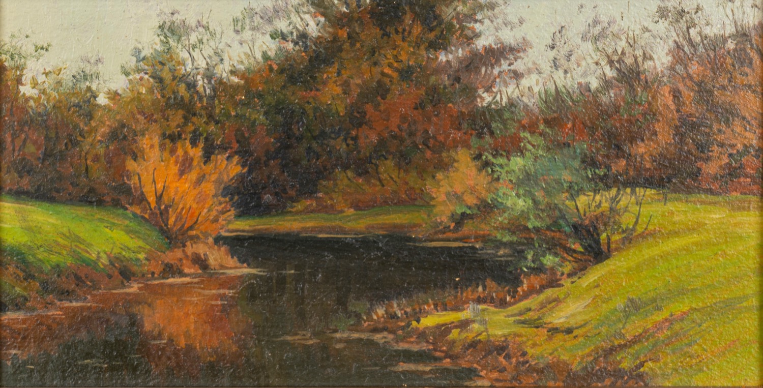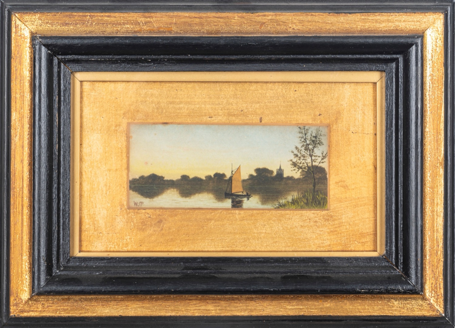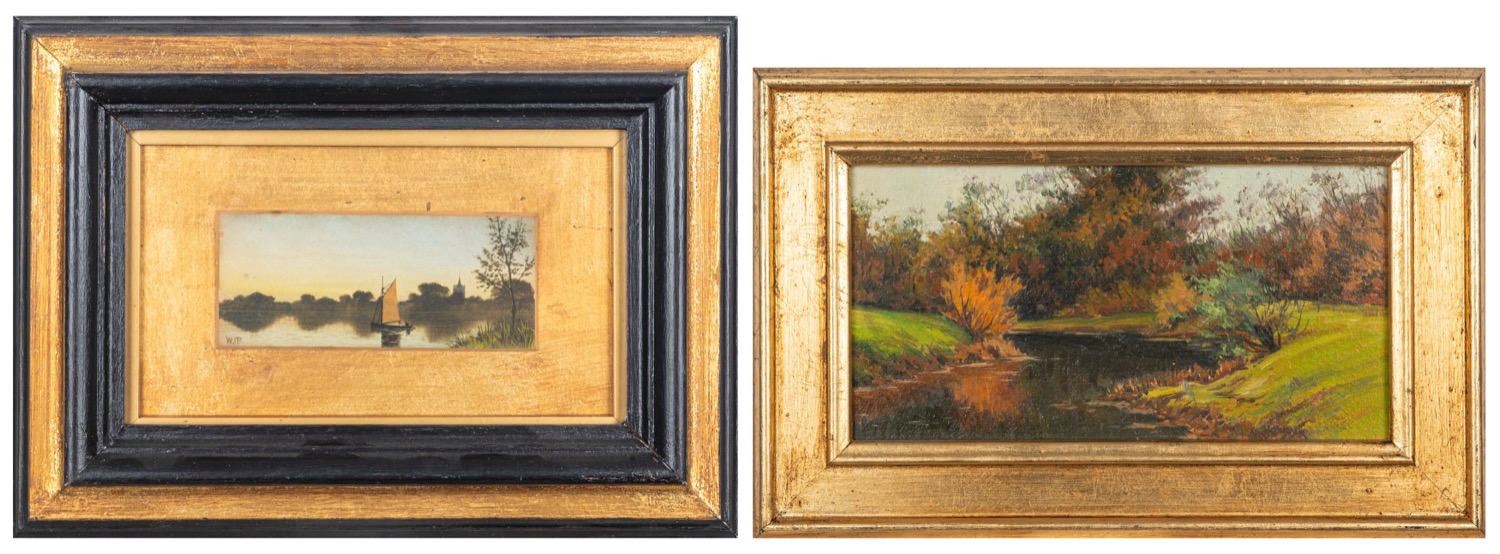 il primo raffigurante paesaggio lacustre con vela, siglato in basso a sinistra: W J P; l'altro raffigurante torrente in un bosco autunnale