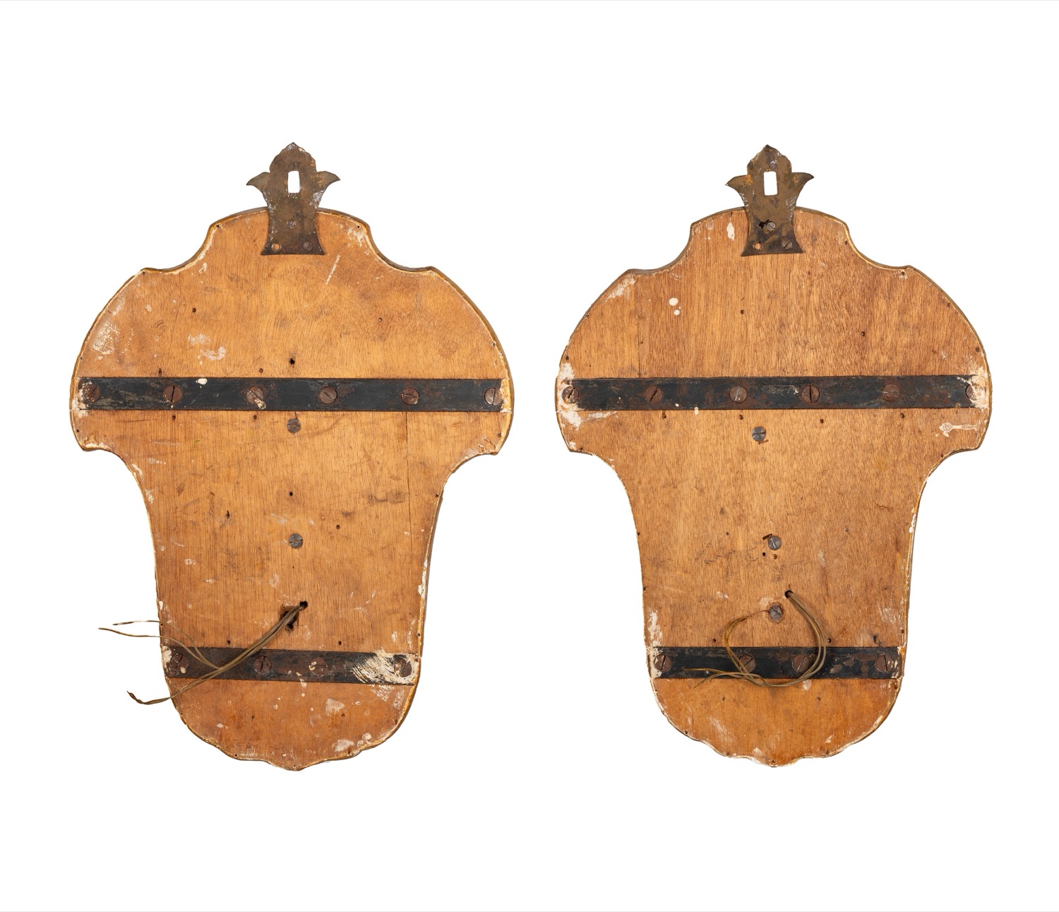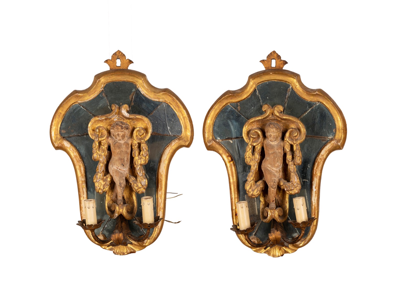 Coppia di applique in legno intagliato e dorato, con specchi al mercurio e puttini a rilievo, secoli XVIII - XIX