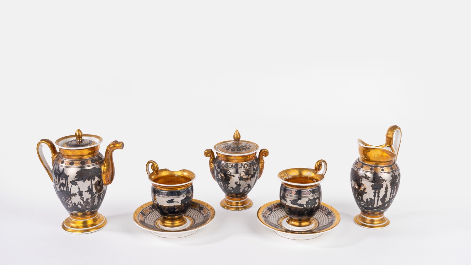 Servizio tete a tete da caffè in porcellana argentata e dorata, secolo XIX
