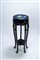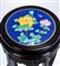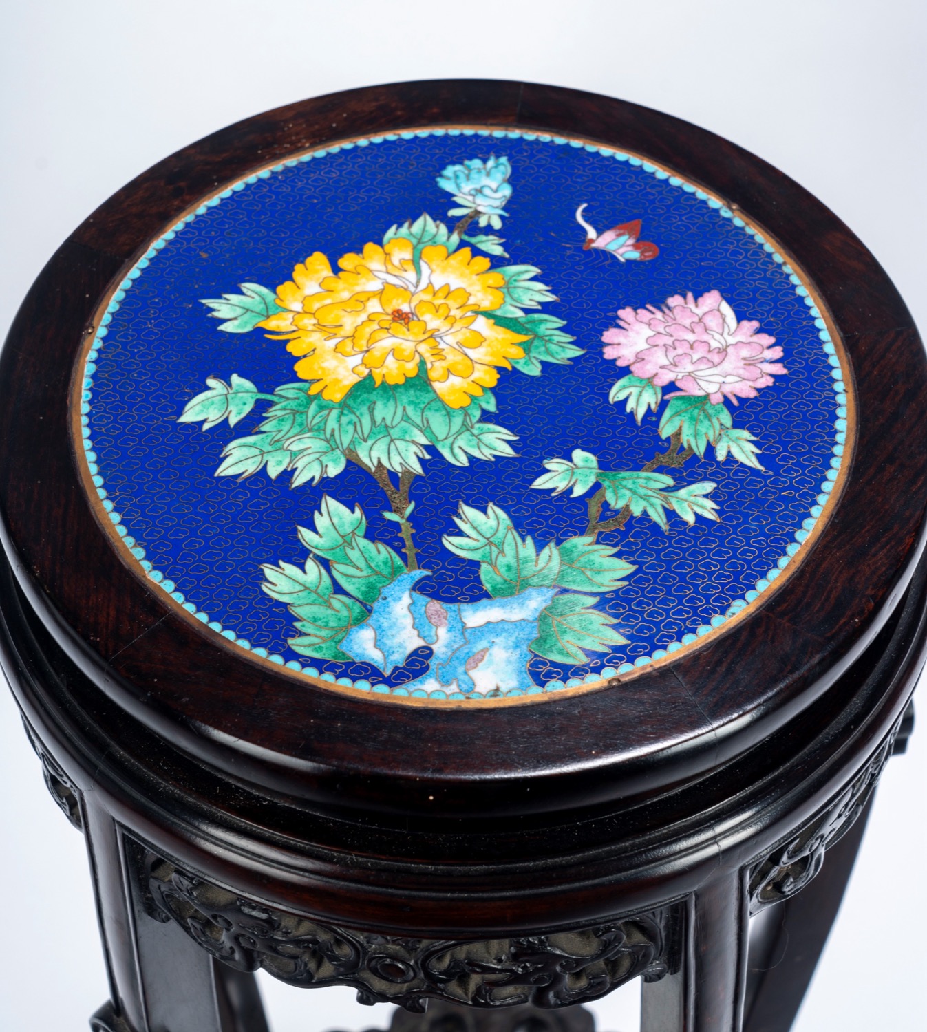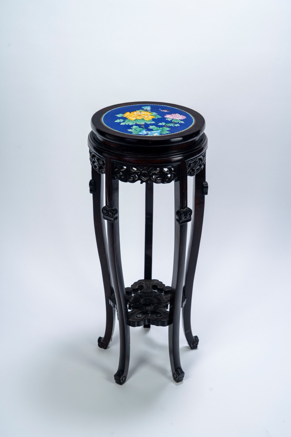 Trespolo portavaso in legno scuro intagliato di gusto orientale, piano in cloisonnè con peonie a sfondo blu, 20th century