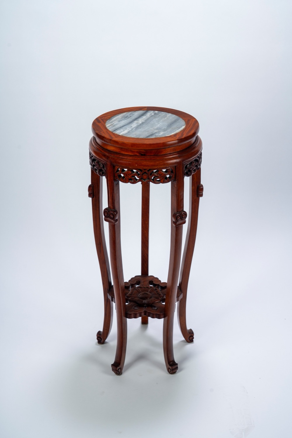 Trespolo portavaso in legno intagliato di gusto orientale con piano in marmo, 20th century