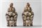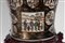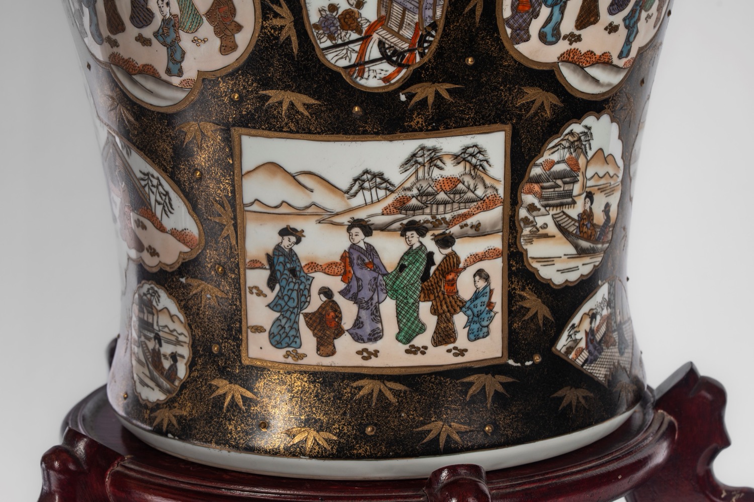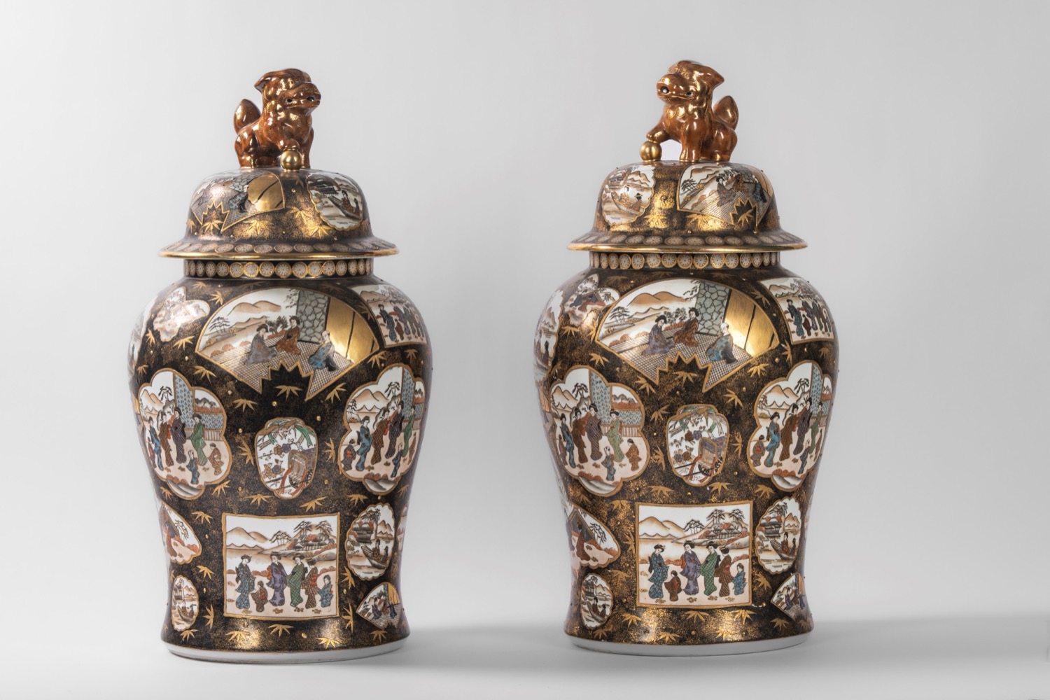 Lotto 151 | Coppia di potiche in porcellana decorate con scene di vita quotidiana entro pannelli su fondo nero con oro, coperchio con shishi, Kutani, Giappone. Basi in legno, 20th century