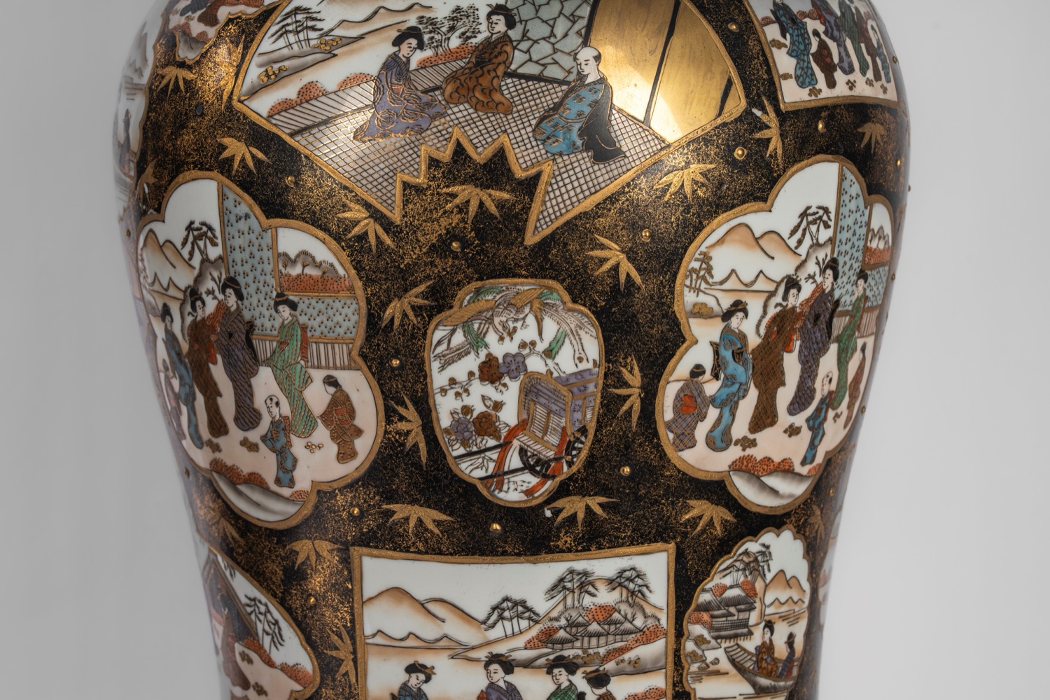 Coppia di potiche in porcellana decorate con scene di vita quotidiana entro pannelli su fondo nero con oro, coperchio con shishi, Kutani, Giappone. Basi in legno, 20th century