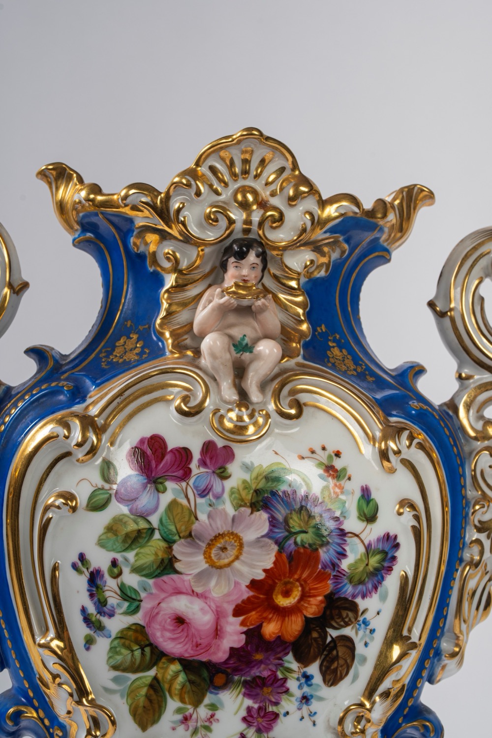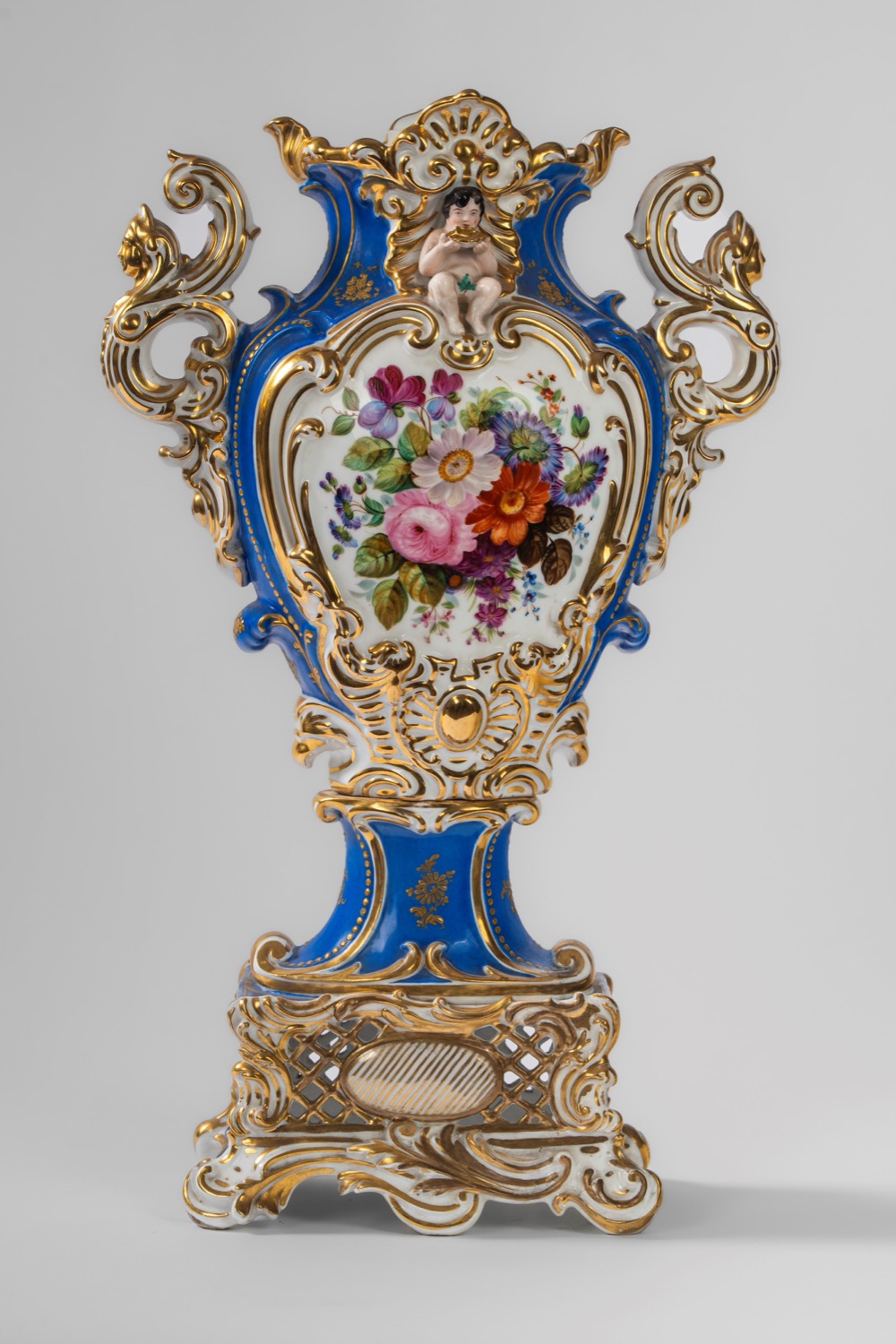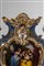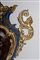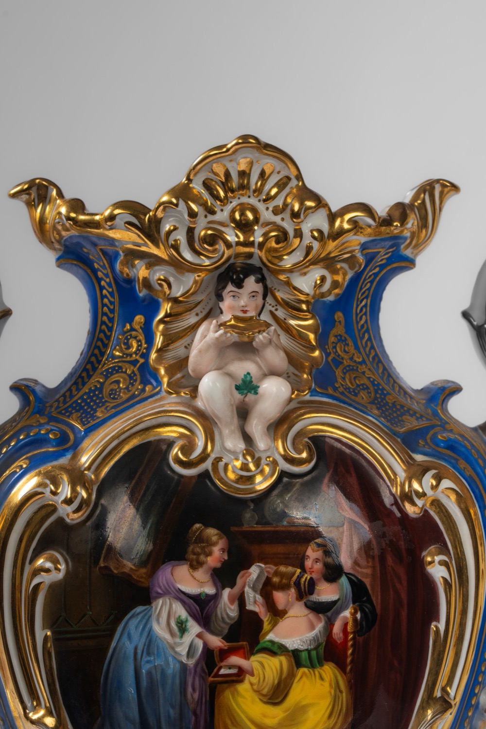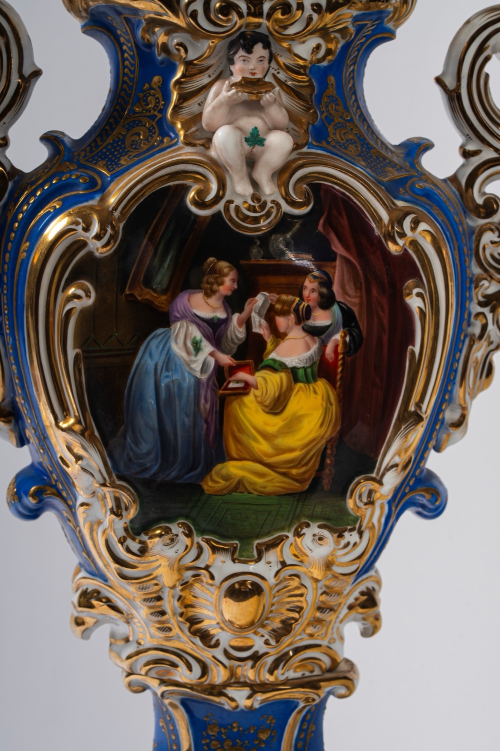Su base a plinto a rocaille con motivo traforato a graticcio, anse mosse a volute. Il corpo decorato sul fronte da scena di interno con tre dame intente nella lettura di una missiva, il retro da bouquet di fiori entro cartella dorata e a rilievo sormontata da putto con conchiglia. Su base a plinto a rocaille con motivo traforato a graticcio, anse mosse a volute. Il corpo decorato sul fronte da scena di interno con tre dame intente nella lettura di una missiva, il retro da bouquet di fiori entro cartella dorata e a rilievo sormontata da putto con conchiglia.