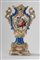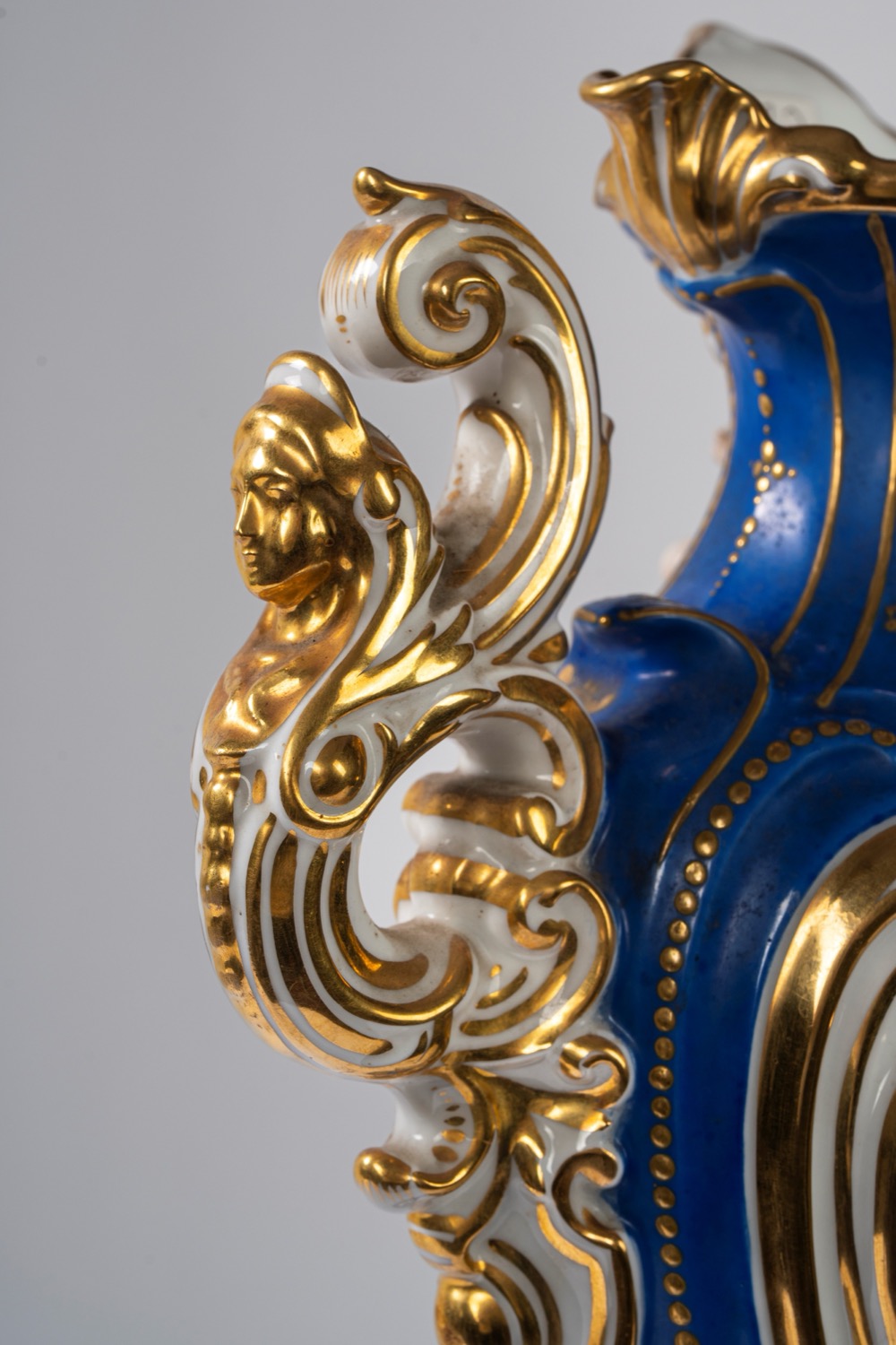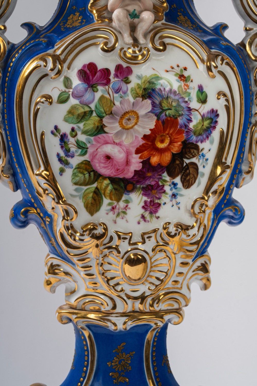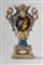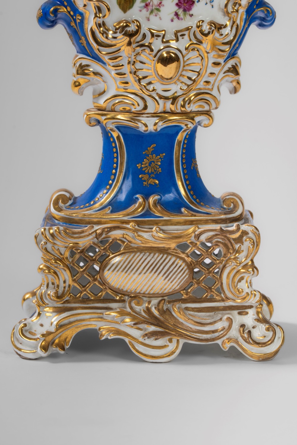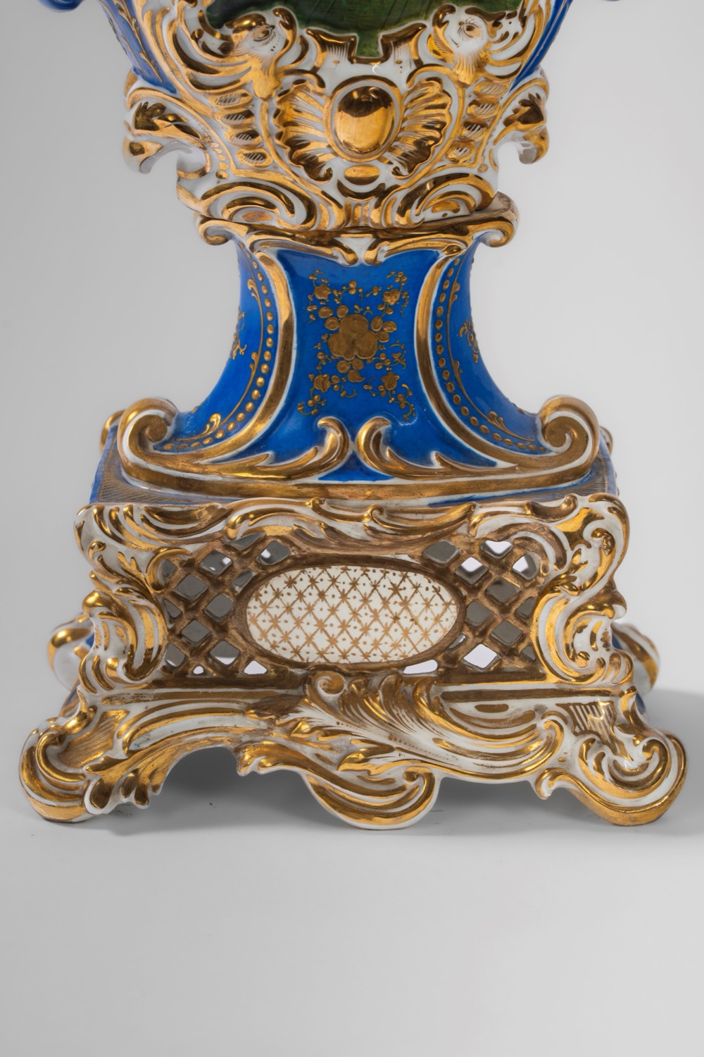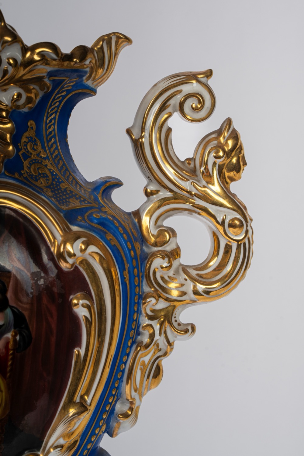 Su base a plinto a rocaille con motivo traforato a graticcio, anse mosse a volute. Il corpo decorato sul fronte da scena di interno con tre dame intente nella lettura di una missiva, il retro da bouquet di fiori entro cartella dorata e a rilievo sormontata da putto con conchiglia. Su base a plinto a rocaille con motivo traforato a graticcio, anse mosse a volute. Il corpo decorato sul fronte da scena di interno con tre dame intente nella lettura di una missiva, il retro da bouquet di fiori entro cartella dorata e a rilievo sormontata da putto con conchiglia.