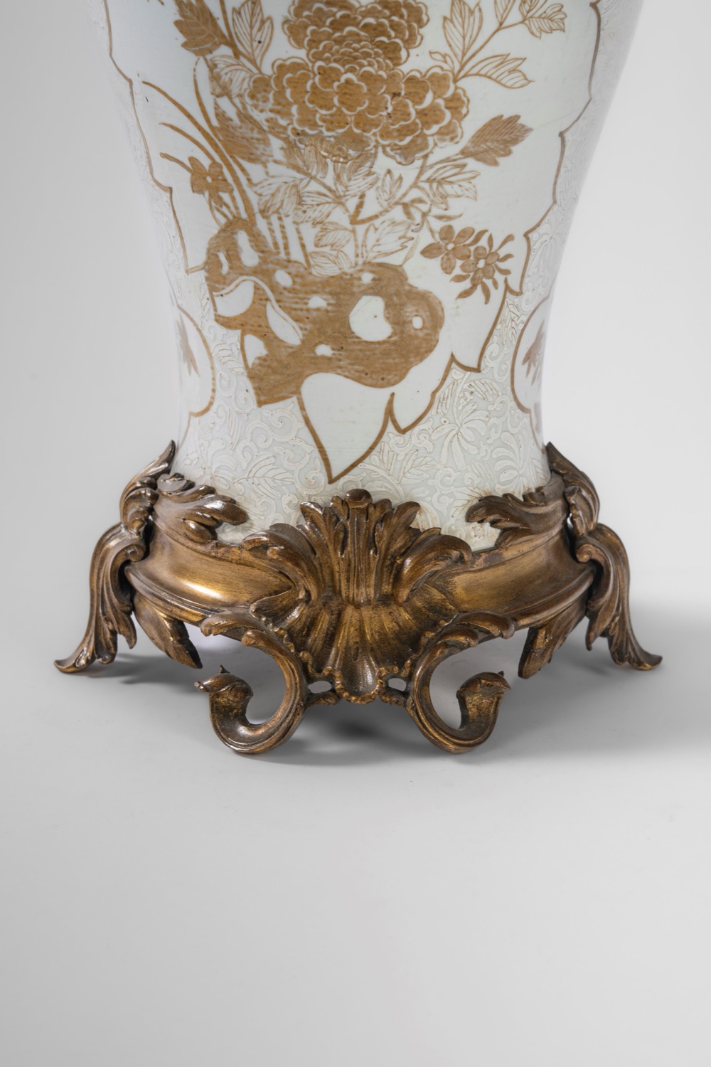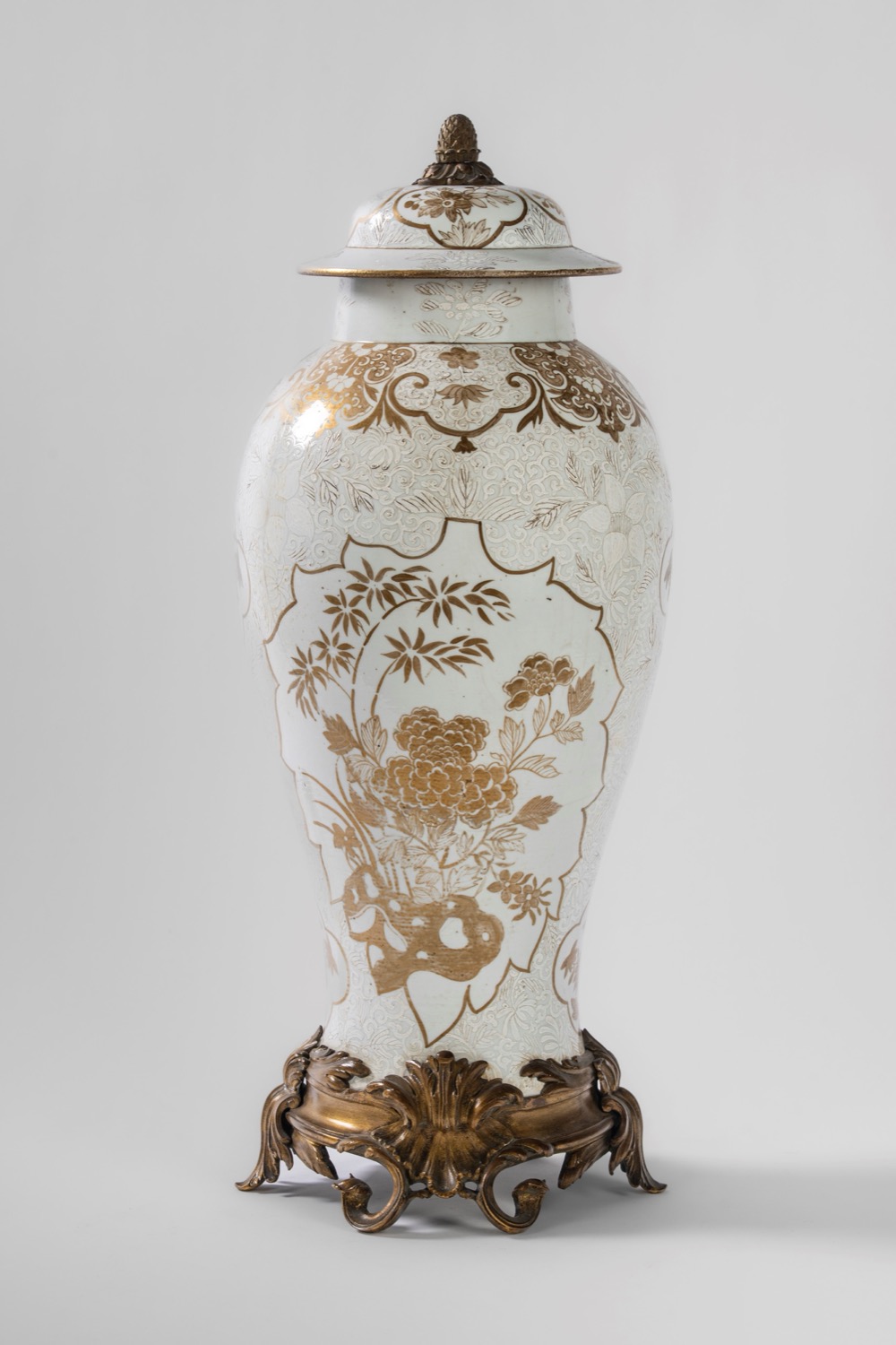Lotto 184 | Potiche in porcellana dipinta a smalto nei toni del bianco e oro a riserve mistilinee decorata a cespi floreali; presa e base in bronzo dorato, Cina XIX secolo