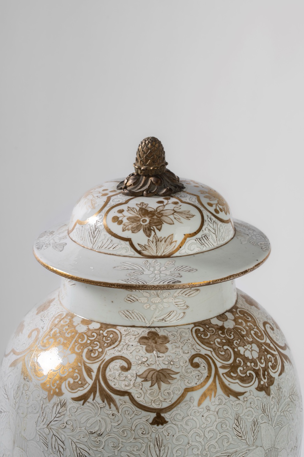 Potiche in porcellana dipinta a smalto nei toni del bianco e oro a riserve mistilinee decorata a cespi floreali; presa e base in bronzo dorato, Cina XIX secolo