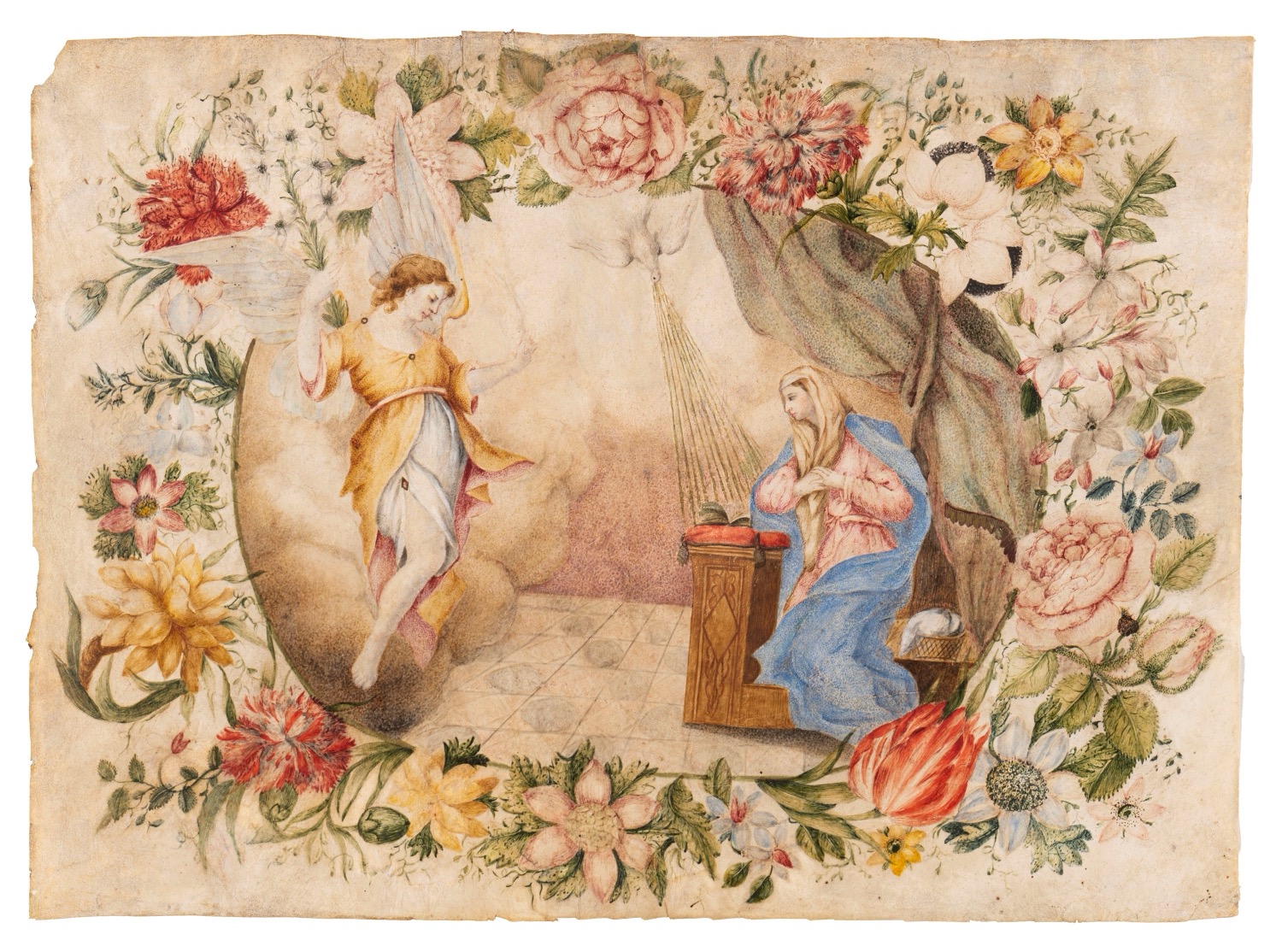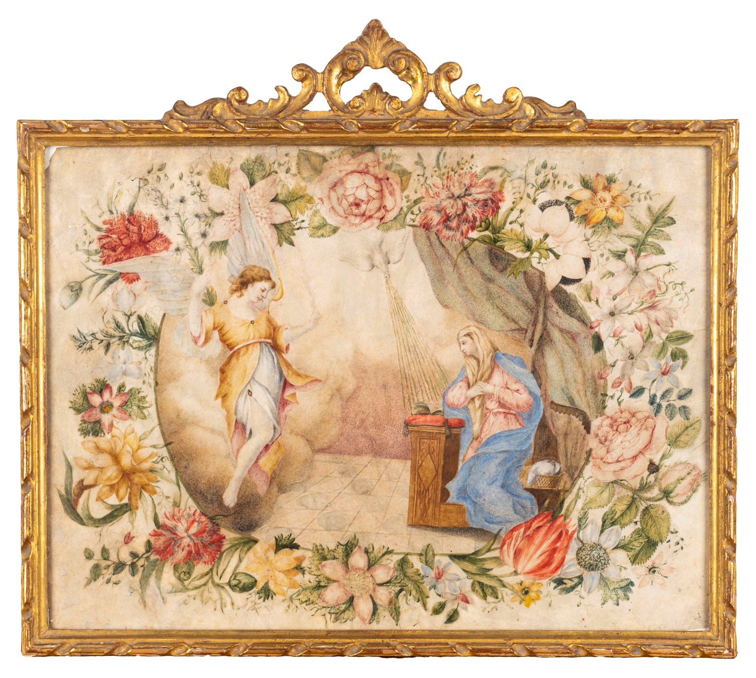 Scuola italiana, secolo XVIII - Annunciazione entro ghirlanda di fiori